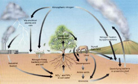 สารประกอบไนโตรเจนจะมีอยู่ในดิน ในน้ำ สิ่งมีชีวิตทุกชนิดต้องการธาตุไนโตรเจนเพื่อสร้างโปรตีนสำหรับการเจริญเติบโต