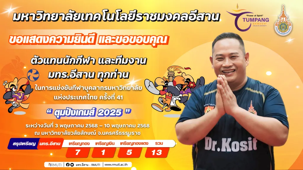 มทร.อีสาน ทำผลงานเยี่ยมผ่านรอบคัดเลือกเขตภาคอีสาน ส่ง 3 ชนิดกีฬา ชิงชัยต่อ “อินทนิลเกมส์” เดือนมกราคม 2569
