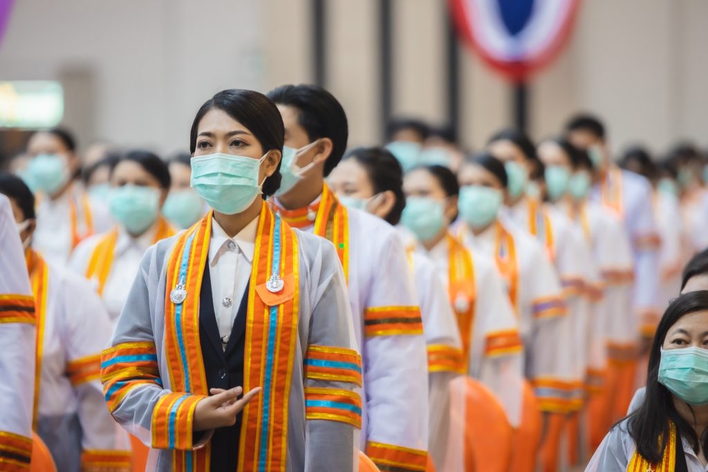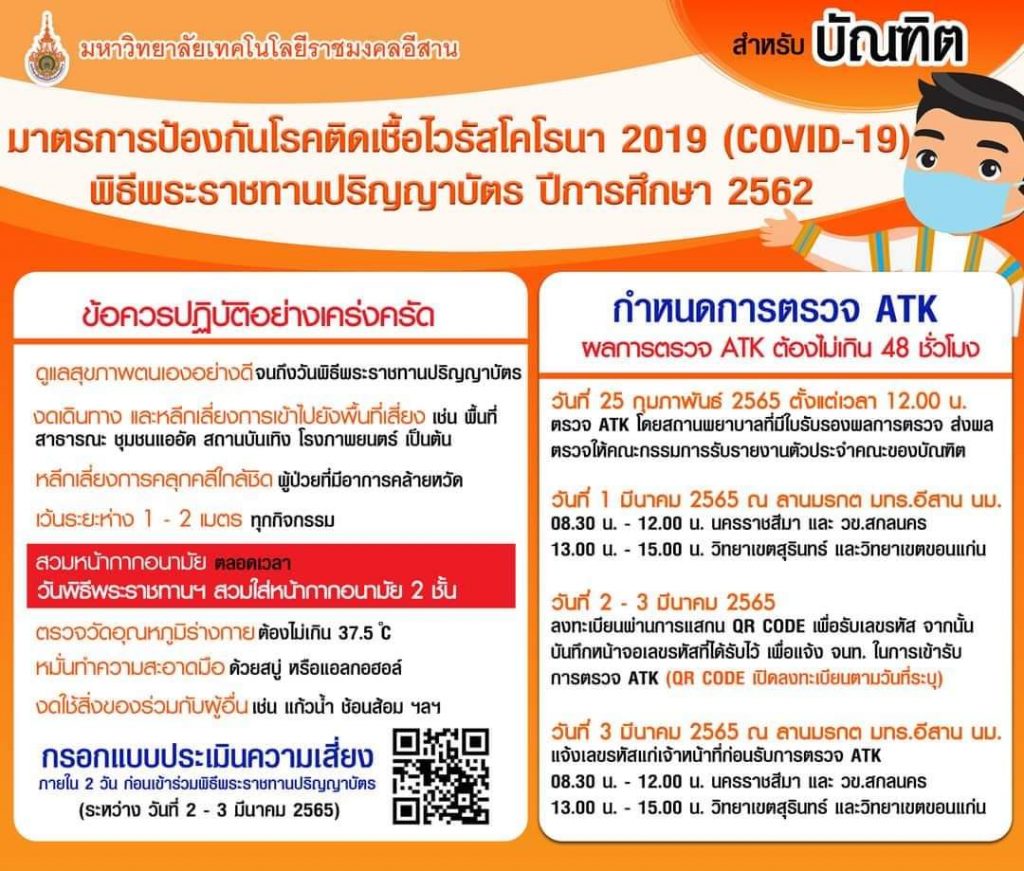 วันที่ 2 มีนาคม 2565 ณ มหาวิทยาลัยเทคโนโลยีราชมงคลอีสาน ศูนย์การศึกษาหนองระเวียง ต.หนองระเวียง อ.เมือง จ.นครราชสีมา รองศาสตราจารย์ ดร.โฆษิต ศรีภูธร อธิการบดี พร้อมด้วยผู้บริหาร คณาจารย์ บัณฑิต มหาบัณฑิตจากทุกวิทยาเขต เข้าร่วมการฝึกซ้อมใหญ่ พิธีพระราชทานปริญญาบัตร มหาวิทยาลัยเทคโนโลยีราชมงคลอีสาน ประจำปีการศึกษา 2562 ภายใต้มาตรการป้องกันการแพร่ระบาดโควิด-19 ซึ่งสำหรับการฝึกซ้อมในวันนี้ มีบัณฑิต มหาบัณฑิตเข้าร่วมพิธีพระราชทานปริญญาบัตร จำนวน 3,890 ราย ช่วงเช้าเป็นบัณฑิตจาก มทร.อึสาน ศูนย์กลางนครราชสีมา มทร.อีสาน วิทยาเขตสุรินทร์ และ มทร.อีสาน วิทยาเขตสกลนคร และในช่วงบ่ายเป็นบัณฑิตจาก มทร.อีสาน ศูนย์กลางนครราชสีมา และ มทร.อีสาน วิทยาเขตขอนแก่น ทั้งนี้บรรยากาศการฝึกซ้อมผ่านไปได้ด้วยดี ซึ่งคาดว่าในวันรับจริง วันที่ 4 มีนาคมนี้ จะสามารถดำเนินการไปได้อย่างราบรื่น และคาดว่าจะมีผู้เดินทางมาร่วมแสดงความยินดีกับผู้สำเร็จการศึกษาจาก มทร.อีสาน เป็นจำนวนมาก ทางมหาวิทยาลัยจึงขอความร่วมมือผู้ที่จะเข้าร่วมงานตรวจคัดกรองตนเองด้วย ATK และแจ้งผลผ่านทาง rmuti.me/5VZKblG55