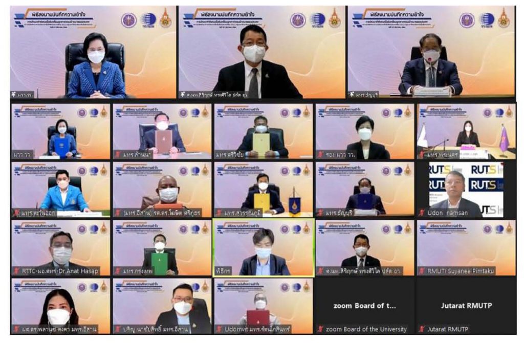 รศ.ดร.โฆษิต ศรีภูธร อธิการบดี มทร.อีสาน ได้เข้าร่วมลงนามความร่วมมือผ่านระบบอิเล็กทรอนิกส์ โครงการพัฒนากำลังคนเพื่อขับเคลื่อนอุตสาหกรรมเป้าหมายของประเทศ ในรูปแบบโปรแกรมหลักสูตร Non-Degree เพื่อเพิ่มพูนทักษะวิชาชีพ (Up skill programs) ระหว่าง ศ.(วิจัย) ดร.ชุติมา เอี่ยมโชติชวลิต ผู้ว่าการสถาบันวิจัยวิทยาศาสตร์และเทคโนโลยีแห่งประเทศไทย (วว.) กับเครือข่ายมหาวิทยาลัยเทคโนโลยีราชมงคล ได้แก่ รศ.สมหมาย ผิวสะอาด อธิการบดี มทร.ธัญบุรี ประธานคณะกรรมการอธิการบดีมหาวิทยาลัยเทคโนโลยีราชมงคล, รศ.อุดมวิทย์ ไชยสกุลเกียรติ รักษาราชการแทนอธิการบดี มทร.รัตนโกสินทร์, นายณัฐวรพล รัชสิริวัชรบุล อธิการบดี มทร.พระนคร, รศ.ประมุข อุณหเลขกะ อธิการบดี มทร.สุวรรณภูมิ, รศ.พิชัย จันทร์มณี รักษาราชการแทนอธิการบดี มทร.กรุงเทพ, ผศ.จัตตุฤทธิ์ ทองปรอน รักษาราชการแทนอธิการบดี มทร.ล้านนา, รศ.ฤกษ์ชัย ฟูประทีปศิริ รักษาราชการแทนอธิการบดี มทร.ตะวันออก และ ศ.สุวัจน์ ธัญรส อธิการบดี มทร.ศรีวิชัย ซึ่งมี ศ.ดร.นพ.สิริฤกษ์ ทรงศิวิไล ปลัดกระทรวงการอุดมศึกษา วิทยาศาสตร์ วิจัยและนวัตกรรม (อว.) เป็นประธานในพิธี เมื่อวันที่ 27 ธันวาคม 2564
