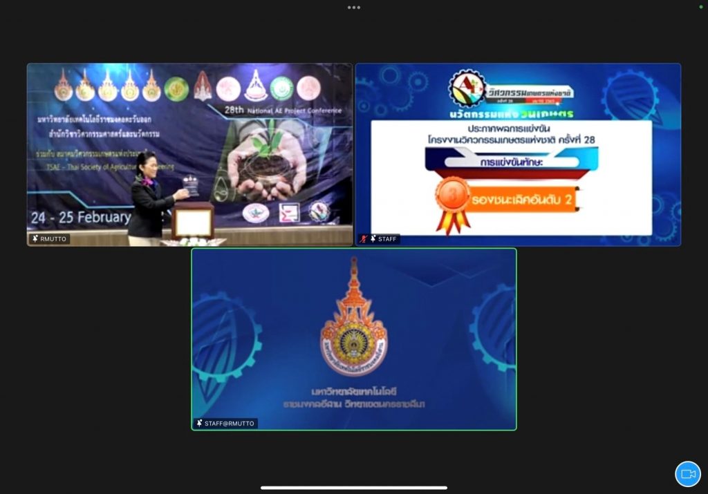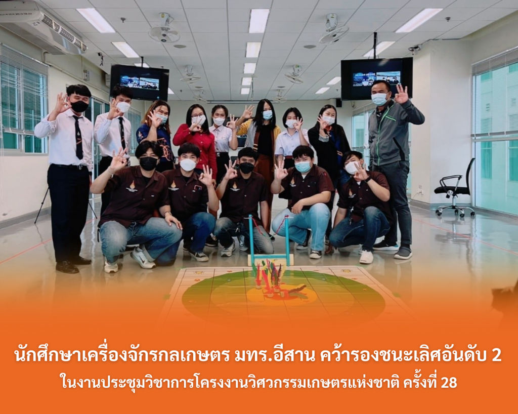 วันที่ 24 กุมภาพันธ์ 2565 นายจตุรพัฒน์พงษ์ ทันลา นายภูมินทร์ ทองสอาด นายชยกร แก้วคง นายศตวรรษ ศรีจันทร์ และนายวรัญญู สัมฤทธิ์ นักศึกษาชั้นปีที่ 2 สาขาวิศวกรรมเครื่องจักรกลเกษตร คณะวิศวกรรมศาสตร์และเทคโนโลยี มหาวิทยาลัยเทคโนโลยีราชมงคลอีสาน นครราชสีมา ได้รับรางวัลรองชนะเลิศอันดับ 2 ในการแข่งขันทักษะด้านวิศวกรรมเกษตร เครื่องยิงเมล็ดพันธุ์ ในงานประชุมวิชาการโครงงานวิศวกรรมเกษตรแห่งชาติ ครั้งที่ 28 ระหว่างวันที่ 24 – 25 กุมภาพันธ์ 2565 จัดโดย สำนักวิชาวิศวกรรมศาสตร์และนวัตกรรม มหาวิทยาลัยเทคโนโลยีราชมงคลตะวันออก ร่วมกับ สมาคมวิศวกรรมเกษตรแห่งประเทศไทย TSAE – Thai Society of Agricultural Engineering ซึ่งนำทีมการแข่งขันโดยอาจารย์ ดร.พีรณัฐ อันสุรีย์ หัวหน้าสาขาฯ