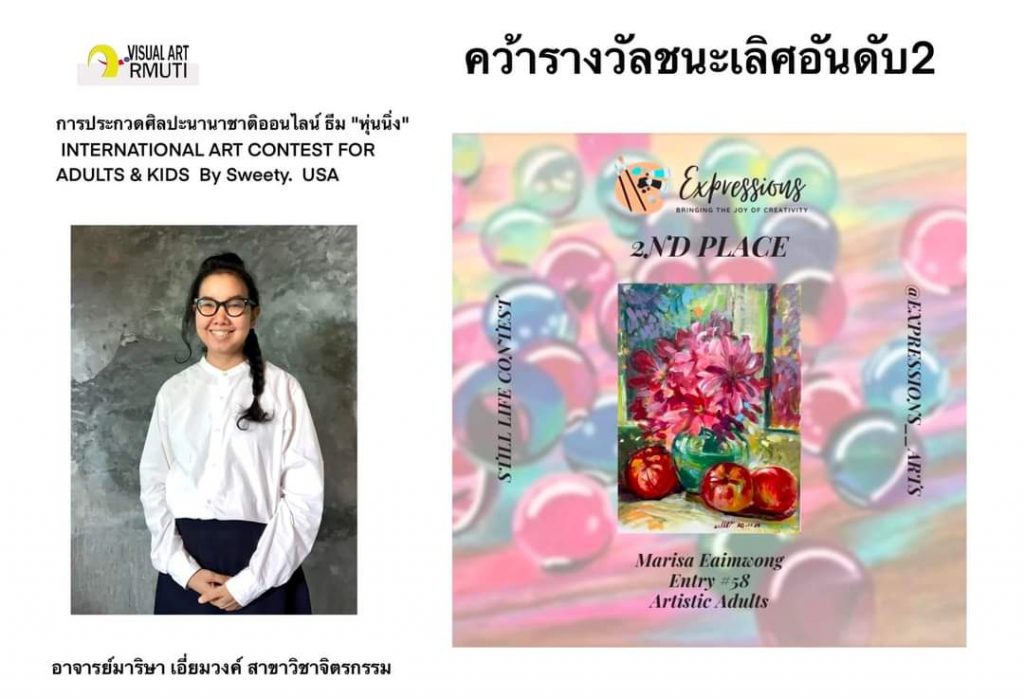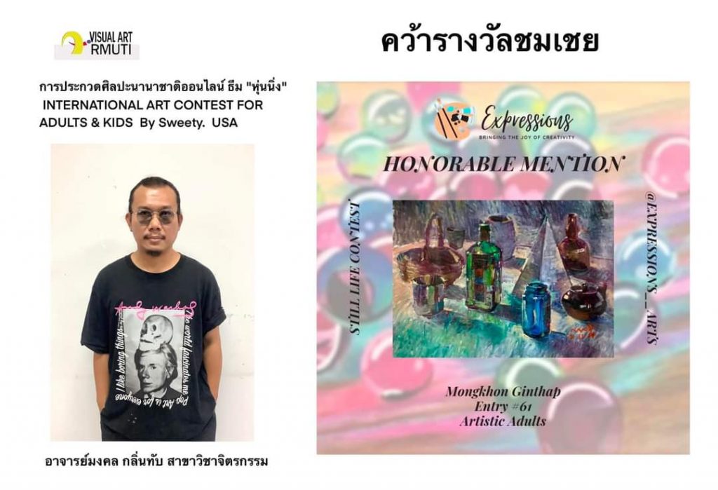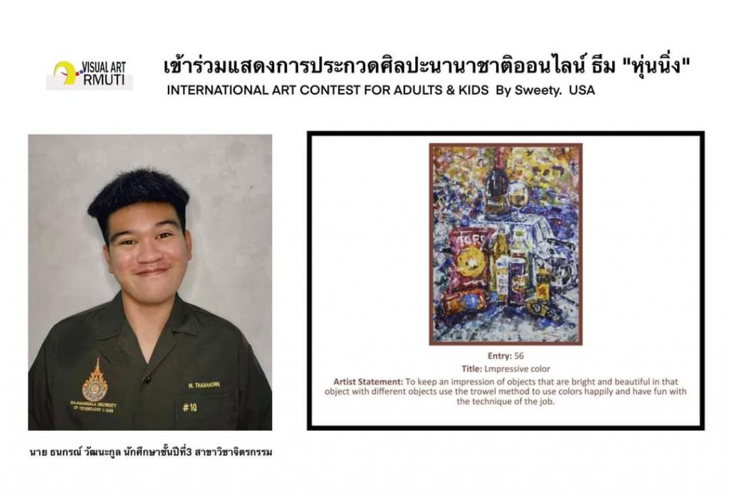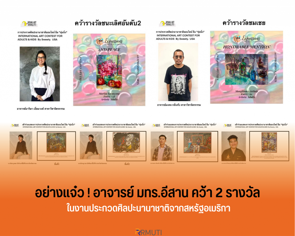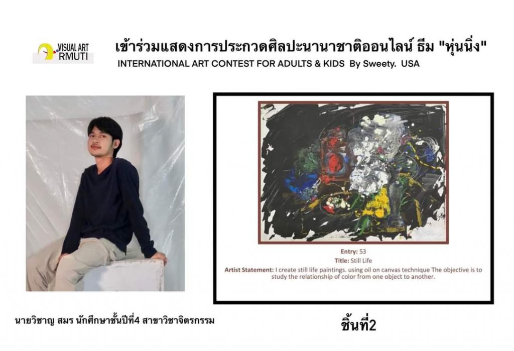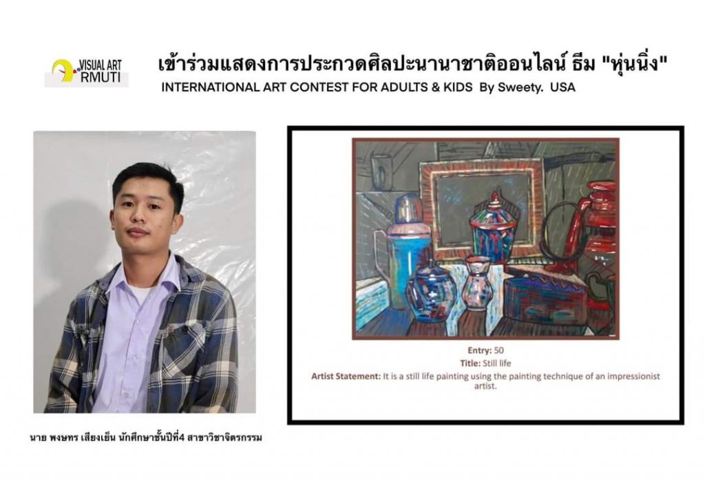 เมื่อเร็ว ๆ นี้ มทร.อีสาน โดย อาจารย์หลักสูตรทัศนศิลป์ สาขาศิลปกรรมและสื่อสร้างสรรค์ คณะสถาปัตย์กรรมศาสตร์และศิลปกรรมสร้างสรรค์ ได้สร้างสรรค์ผลงานศิลปะส่งเข้าประกวด ในการประกวดศิลปะนานาชาติออนไลน์ ธีม “หุ่นนิ่ง” INTERNATIONAL ART CONTEST FOR ADULTS & KIDS By Sweety Saradha Arts (USA) ทั้งยังได้สนับสนุนให้นักศึกษาเข้าร่วมเปิดประสบการณ์โดยการส่งผลงานเข้าร่วมประกวดในงานนี้ด้วย