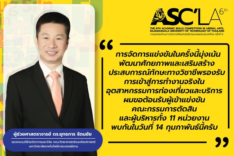 ผู้ช่วยศาสตราจารย์ ดร.ยุทธการ รัตนชัย รองคณบดีฝ่ายวิชาการและวิจัย ได้เปิดเผยถึงข้อมูลของสถาบันและที่เข้าร่วมการแข่งขันและรายการที่จัดการแข่งขั้นในครั้งนี้ว่า “การแข่งขันทักษะวิชาการศิลปศาสตร์ราชมงคลแห่งประเทศไทยมีประจำต่อเนื่องทุกปี โดยมหาวิทยาลัยเทคโนโลยีราชมงคล ทั้ง 9 แห่ง ประกอบด้วยมหาวิทยาลัยเทคโนโลยีราชมงคลกรุงเทพ (มทร.กรุงเทพ) มหาวิทยาลัยเทคโนโลยีราชมงคลตะวันออก (มทร.ตะวันออก) มหาวิทยาลัยเทคโนโลยีราชมงคลรัตนโกสินทร์ (มทร.รัตนโกสินทร์) มหาวิทยาลัยเทคโนโลยีราชมงคลพระนคร (มทร.พระนคร) มหาวิทยาลัยเทคโนโลยีราชมงคลธัญบุรี (มทร.ธัญบุรี) มหาวิทยาลัยเทคโนโลยีราชมงคลศรีวิชัย (มทร.ศรีวิชัย) มหาวิทยาลัยเทคโนโลยีราชมงคลสุวรรณภูมิ (มทร.สุวรรณภูมิ) มหาวิทยาลัยเทคโนโลยีราชมงคลล้านนา (มทร.ล้านนา) และ มหาวิทยาลัยเทคโนโลยีราชมงคลอีสาน (มทร.อีสาน) ซึ่งปีนี้เป็นเจ้าภาพจัดการแข่งขัน โดยมีการจัดการแข่งขัน 4 ประเภท ได้แก่ ประเภทที่ 1 การแข่งขันทักษะภาษาอังกฤษ ประกอบด้วยการแข่งขันการอ่านข่าวภาษาอังกฤษ และการแข่งขันการร้องเพลงภาษาอังกฤษ ประเภทที่ 2 การแข่งขันทักษะภาษาไทย โดยมีการแข่งขันการอ่านออกเสียงภาษาไทย ประเภทที่ 3 การแข่งขันทักษะภาษาจีน โดยมีการแข่งขันการอ่านข่าวภาษาจีน และประเภทที่ 4 การแข่งขันทักษะด้านการท่องเที่ยว ประกอบด้วยการแข่งขันทักษะด้านมัคคุเทศก์ (ภาษาไทย-ภาษาอังกฤษ) และการแข่งขันการนำเสนอรายการนำเที่ยว โดยการจัดการแข่งขันทั้ง 4 ประเภทมุ่งเน้นการพัฒนาศักยภาพและเสริมสร้างประสบการณ์ทักษะทางวิชาชีพรองรับการเข้าสู่การทำงานจริงในอุตสาหกรรมการท่องที่ยวและบริการ”