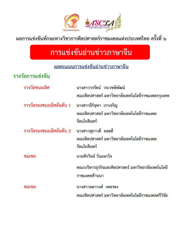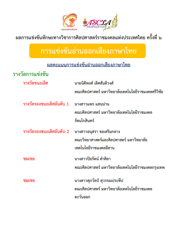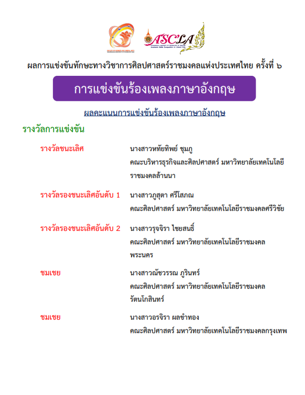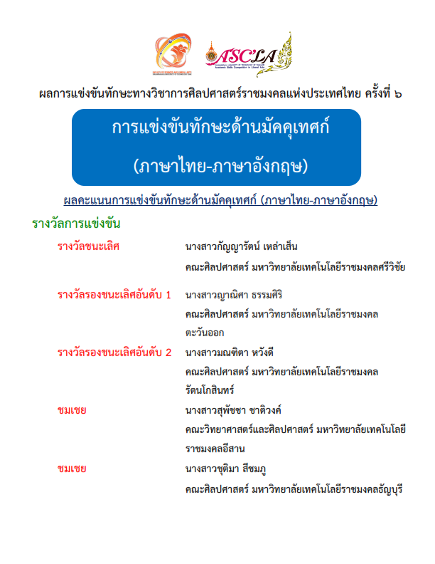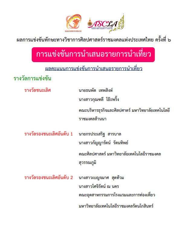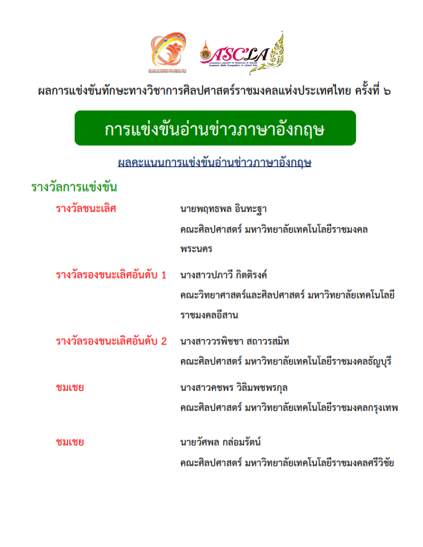 ทั้งนี้สำหรับผลการแข่งขันของแต่ละประเภท ติดตามได้ดังนี้ ผลการแข่งขันทักษะทางวิชาการศิลปศาสตร์ราชมงคลแห่งประเทศไทย ครั้งที่ ๖.pdf – Google ไดรฟ์