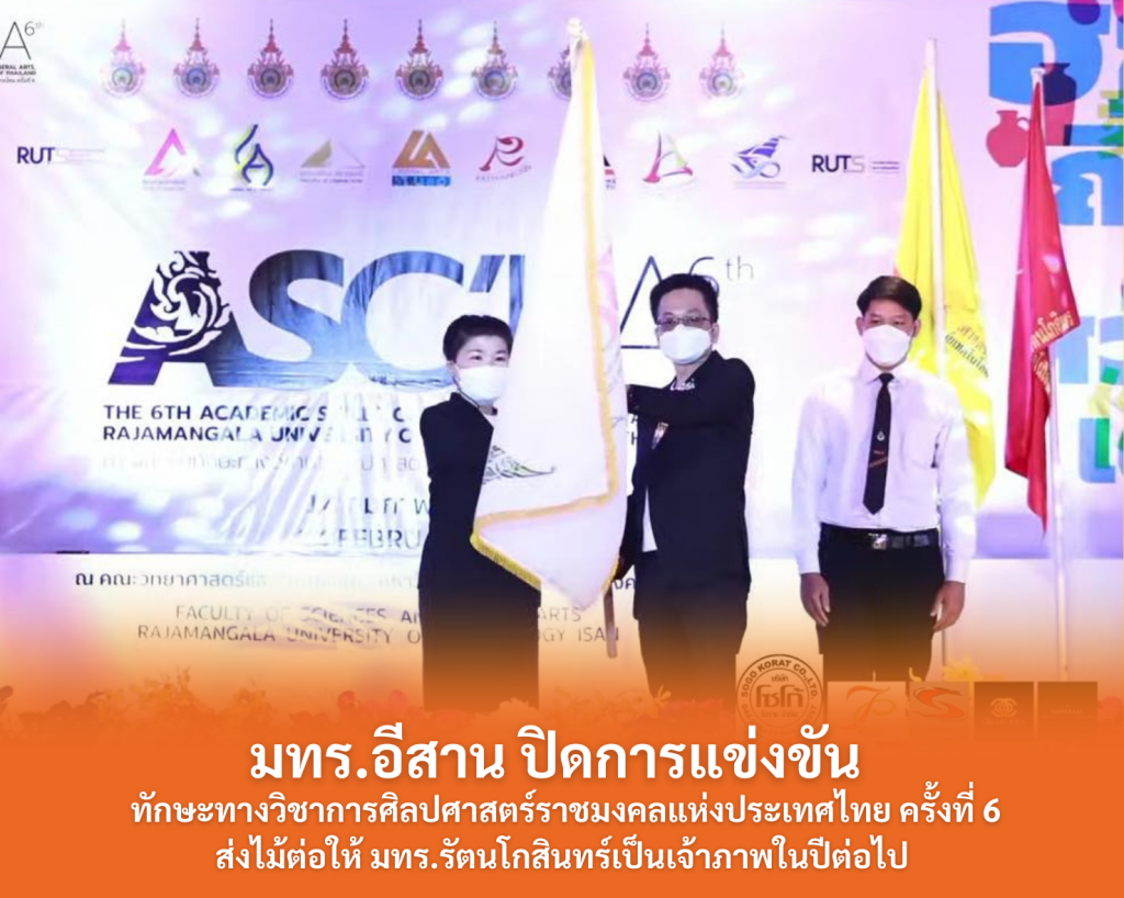 มทร.อีสานโดย คณะวิทยาศาสตร์และศิลปศาสตร์ เป็นเจ้าภาพจัดการแข่งขันทักษะทางวิชาการศิลปศาสตร์ราชมงคลแห่งประเทศไทย ครั้งที่ 6 โดยมี รองศาสตราจารย์ ดร.โฆษิต ศรีภูธร อธิการบดี มทร.อีสาน เป็นประธานเปิดงาน ซึ่งในพิธีปิดมี รองศาสตราจารย์ ดร.ณรงค์ศักดิ์ ธรรมโชติ รองอธิการบดีฝ่ายวิชาการและวิเทศสัมพันธ์ มทร.อีสาน เป็นประธานปิดการแข่งขัน ณ อาคาร 35 มหาวิทยาลัยเทคโนโลยีราชมงคลอีสาน นครราชสีมา การแข่งขันทักษะทางวิชาการศิลปศาสตร์ราชมงคลแห่งประเทศไทย ครั้งที่ 6 จัดขึ้นในรูปแบบออนไลน์ โดยมีผู้เข้าร่วมแข่งขันทั้งสิ้นรวมจำนวน 102 คน ซึ่งเป็นนักศึกษาจากมหาวิทยาลัยเทคโนโลยีราชมงคลทั้ง 9 แห่ง กิจกรรมการแข่งขัน ประกอบด้วยการแข่งขัน 4 ประเภท แบ่งเป็น 6 รายการแข่งขัน ได้แก่ การแข่งขันการอ่านข่าวภาษาอังกฤษ การแข่งขันการร้องเพลงภาษาอังกฤษ การแข่งขันการอ่านออกเสียงภาษาไทย การแข่งขันการอ่านข่าวภาษาจีน การแข่งขันทักษะด้านมัคคุเทศก์ (ภาษาไทย-ภาษาอังกฤษ) การแข่งขันการนำเสนอรายการนำเที่ยว โดยการจัดงานในครั้งนี้ได้รับการสนับสนุนจาก 1. บริษัท โซโก้โคราช จำกัด 2. โรงแรม ดิ อิมพีเรียล โฮเทล แอนด์ คอนเวนชั่น เซ็นเตอร์ โคราช 3. บริษัท ออร่าไบร์ท ไทยเเลนด์ ภายใต้แบรนด์ ชาลีนคอสเมท 4. บริษัท ทีซี ไซเอนซ์ เทรดดิ้ง จำกัด 5. ห้างหุ้นส่วนจำกัดสิริสาส์น อินเตอร์กรุ๊ป โดยในพิธีปิดการแข่งขัน อาจารย์ ดร.ชาคริต นวลฉิมพลี คณบดีคณะวิทยาศาสตร์และศิลปศาสตร์ ได้มอบธงการแข่งขันให้แก่มหาวิทยาลัยเทคโนโลยีราชมงคลรัตนโกสินทร์ ซึ่งจะเป็นเจ้าภาพจัดการแข่งขันในครั้งต่อไป พร้อมกับขอบคุณคณะผู้บริหารมหาวิทยาลัย คณะกรรมการจัดงาน คณาจารย์ และนักศึกษาที่ได้ร่วมแรงร่วมใจทำให้การจัดงานในครั้งนี้สำเร็จลุล่วงไปได้ด้วยดี