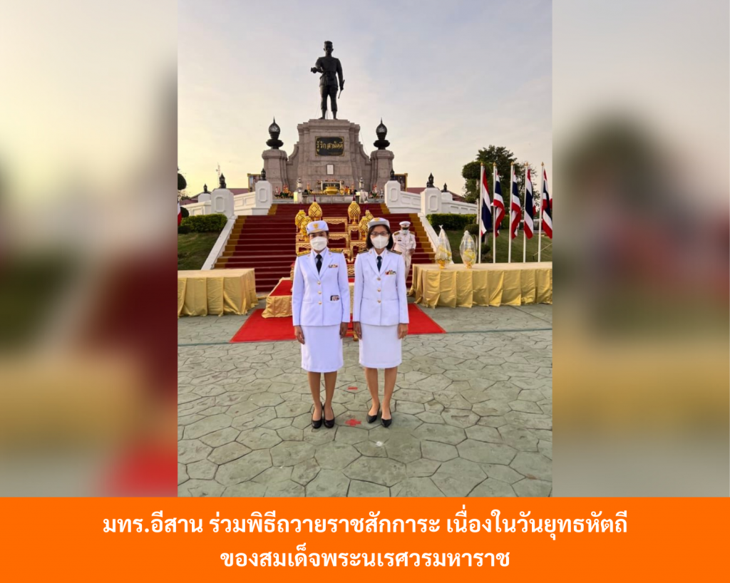 วันที่ 18 มกราคม 2565 มทร.อีสาน โดย ผู้ช่วยศาสตราจารย์ พรพัสสร อ่อนเกิด ผู้อำนวยการสำนักวิทยบริการและเทคโนโลยีสารสนเทศ และ นางสาวนรารักษ์ บุตรชา รองผู้อำนวยการฝ่ายวิทยบริการ สำนักวิทยบริการและเทคโนโลยีสารสนเทศ ร่วมวางพานพุ่มดอกไม้ถวายราชสักการะ เนื่องในวันยุทธหัตถีของสมเด็จพระนเรศวรมหาราช ณ ลานหน้ากองบัญชาการ กองทัพภาคที่ 2 ค่ายสุรนารี อ.เมือง จ.นครราชสีมา