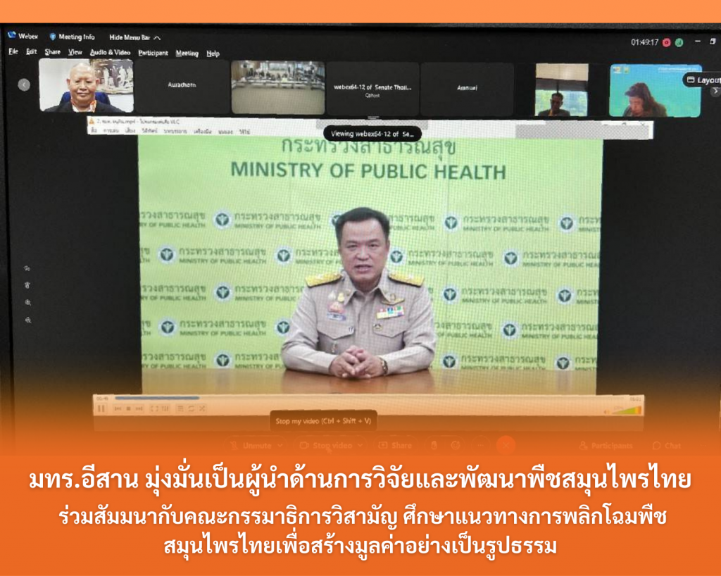 รองศาสตราจารย์ ดร.โฆษิต ศรีภูธร อธิการบดี มทร.อีสาน ในนามคณะอนุกรรมาธิการด้านการผลิตพืชสมุนไพร วิจัยและนวัตกรรม และการนำไปใช้ประโยชน์ ได้เข้าร่วมสัมมนาคณะกรรมาธิการวิสามัญ ศึกษาแนวทางการพลิกโฉมพืชสมุนไพรไทยด้วยการวิจัยและนวัตกรรม วุฒิสภา ครั้งที่ 1 เรื่อง “แนวทางการพลิกโฉมพืชสมุนไพรด้วยการวิจัยและนวัตกรรม” เมื่อวันที่ 17 กุมภาพันธ์ 2565 ณ ห้องประชุม 401 และ 402-403 ชั้น 4 อาคารรัฐสภา และผ่านสื่ออิเล็กทรอนิกส์ โปรแกรม Cisco Webex Meeting โดยมี พลอากาศเอกประจิน จั่นตอง ประธานคณะกรรมาธิการ เป็นประธานกล่าวเปิดการสัมมนา ซึ่งมี นายอนุทิน ชาญวีรกูล รองนายกรัฐมนตรี และรัฐมนตรีว่าการกระทรวงสาธารณสุข ให้เกียรติกล่าวปาฐกถาพิเศษ พลเรือเอกชาญชัย เจริญสุวรรณ นายกสภาการแพทย์แผนไทย และนายแพทย์ธิติ แสวงธรรม รองอธิบดีกรมการแพทย์แผนไทย ได้กล่าวถึงแผนการขับเคลื่อนสมุนไพรไทย สภาพปัญหาและข้อจำกัดในการขับเคลื่อนด้านสมุนไพรไทย รวมถึงการนำนวัตกรรมมาผลักดันด้านสมุนไพรไทย สร้างความตระหนักรู้ร่วมกันกับทุกภาคส่วนในการขับเคลื่อนพืชสมุนไพรไทยให้มีมาตรฐาน มีคุณภาพ และสร้างความมั่นใจให้กับผู้นำไปใช้ประโยชน์ทั้งในประเทศและต่างประเทศ