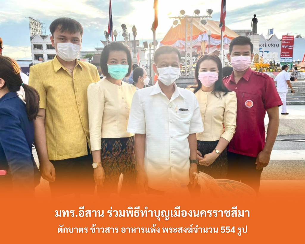 วันที่ 23 มีนาคม 2565 มทร.อีสาน โดย รศ.ดร.โฆษิต ศรีภูธร อธิการบดี มอบหมายให้ ผศ.สุรพจน์ วัชโรภากุล รองอธิการบดีฝ่ายกิจการนักศึกษาและศิษย์เก่าสัมพันธ์ นางสาวสุวรรณี ทนงสำโรง พลเสน หัวหน้างานพัฒนาทักษะ วินัยและประสบการณ์นักศึกษา นางสาวดุษฎี โชติชัชวาลกุล นักวิชาการการศึกษา กองพัฒนานักศึกษา และ อาจารย์ภัคพล รถเพ็ชร วิทยาลัยนวัตกรรมวิชาชีพ สถาบันสหสรรพศาสตร์ เข้าร่วมทำบุญตักบาตร ข้าวสาร อาหารแห้ง พระสงฆ์จำนวน 554 รูป ในพิธีทำบุญเมืองนครราชสีมา เพื่อความเป็นสิริมงคลแก่บ้านเมือง และความผาสุกของประชาชน ตลอดจนเป็นการรักษาประเพณีอันดีงามชาติไทยให้คงอยู่สืบไป ณ บริเวณลานอนุสาวรีย์ อ.เมือง จ.นครราชสีมา