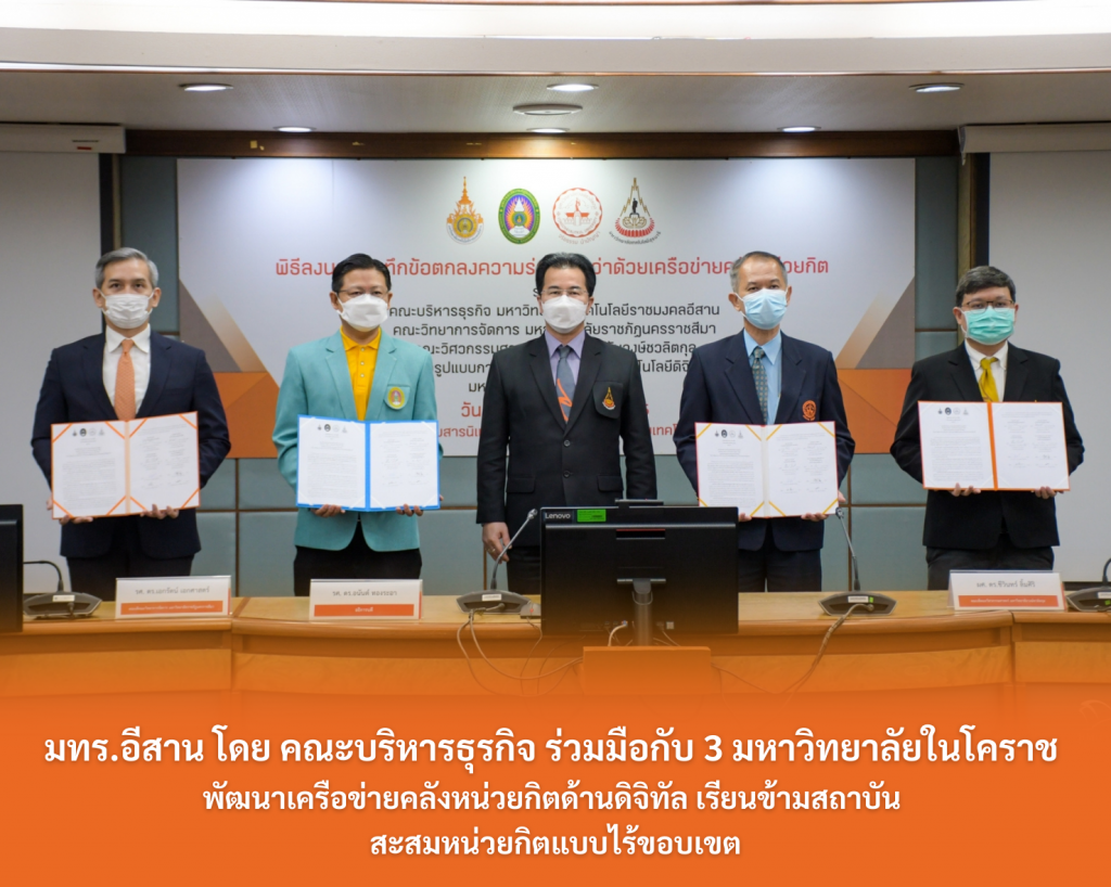 วันที่ 23 มีนาคม 2565 คณะบริหารธุรกิจ มหาวิทยาลัยเทคโนโลยีราชมงคลอีสาน (มทร.อีสาน) ร่วมกับ มหาวิทยาลัยเทคโนโลยีสุรนารี (มทส.) โดย โครงการจัดรูปแบบการบริหารวิชาการด้านเทคโนโลยีดิจิทัลรูปใหม่ คณะวิทยาการจัดการ มหาวิทยาลัยราชภัฏนครราชสีมา (มรภ.นครราชสีมา) และ คณะวิศวกรรมศาสตร์ มหาวิทยาลัยวงษ์ชวลิตกุล (มว.) พัฒนาเครือข่ายคลังหน่วยกิตระดับปริญญาตรี หลักสูตรมอดูลร่วมทางด้านดิจิทัล เป็นครั้งแรกในประเทศไทยที่ผู้เรียนสามารถสะสมหน่วยกิตระหว่างมหาวิทยาลัยเทคโนโลยีราชมงคล มหาวิทยาลัยราชภัฏ มหาวิทยาลัยเอกชน และมหาวิทยาลัยในกำกับของรัฐ ได้อย่างไร้พรมแดน