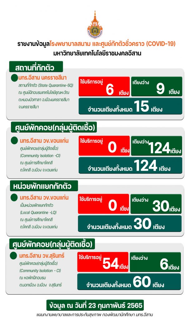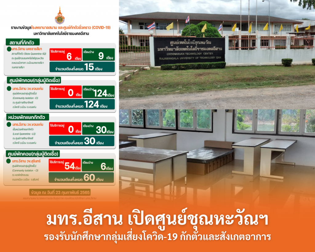 มทร.อีสาน เปิดศูนย์กักตัวชั่วคราว ณ ศูนย์ฝึกอบรมเทคโนโลยีชุณหะวัณ มทร.อีสาน ตั้งอยู่ที่ภายในเขตอุตสาหกรรมสุรนารี ต.หนองบัวศาลา อ.เมือง จ.นครราชสีมา เพื่อรองรับนักศึกษาและบุคลากรกลุ่มเสี่ยงผู้สัมผัสใกล้ชิดผู้ป่วยโควิด-19 โดยใช้พื้นที่ของมหาวิทยาลัยแยกกักตัวและสังเกตอาการตนเอง ซึ่งมีจำนวนเตียงรองรับทั้งหมด 15 เตียง และปัจจุบันมีผู้เข้ากักตัวอยู่จำนวน 6 ราย โดยเบื้องต้นทั้ง 6 รายนี้ ยังไม่มีอาการแต่อย่างใด ทั้งนี้ มทร.อีสาน ได้จัดเจ้าหน้าที่จากแผนกงานพยาบาลฯ ของมหาวิทยาลัยให้คอยติดตามอาการของผู้เข้ากักตัวอย่างต่อเนื่อง