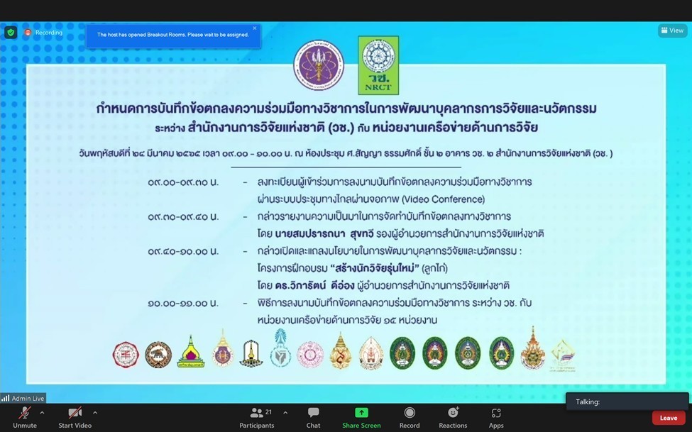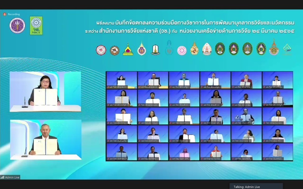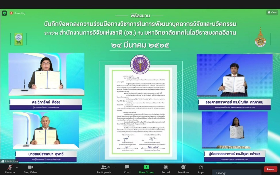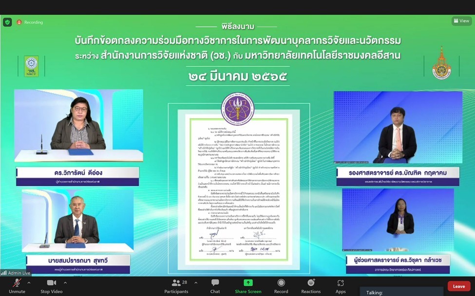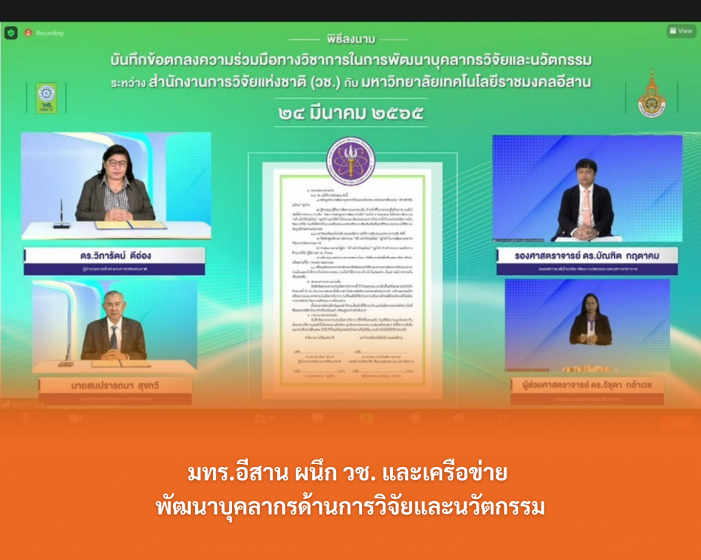 วันที่ 24 มีนาคม 2565 รศ.ดร.โฆษิต ศรีภูธร อธิการบดี มทร.อีสาน มอบหมายให้ รศ.ดร.บัณฑิต กฤตาคม รองอธิการบดีฝ่ายวิจัย พัฒนานวัตกรรม และบริการวิชาการ มทร.อีสาน และ ผศ.ดร.วิชุดา กล้าเวช อาจารย์คณะวิทยาศาสตร์และศิลปศาสตร์ ผู้รับผิดชอบโครงการ ได้เข้าร่วมพิธีลงนามบันทึกข้อตกลงความร่วมมือทางวิชาการในการพัฒนาบุคลากรและนวัตกรรม ระหว่าง สำนักงานการวิจัยแห่งชาติ (วช.) กับ หน่วยงานเครือข่ายด้านการวิจัยผ่านระบบประชุมทางไกลผ่านจอภาพ (Video Conference) โดยมี ผศ.ดุษฎี เทียมเทศ บุญมาสูงทรง และ ดร.ณัฐภรณ์ สุทธิวิจิตรภักดี รองผู้อำนวยการสถาบันบริการวิชาการแห่ง มทร.อีสาน เข้าร่วมเป็นพยานในการลงนามครั้งนี้ ทั้งนี้ภายในงานได้มีการเปิดและแถลงนโยบายการพัฒนาบุคลากรวิจัยและนวัตกรรม โครงการฝึกอบรมสร้างนักวิจัยรุ่นใหม่ (ลูกไก่) ประจำปี 2565 ด้วย