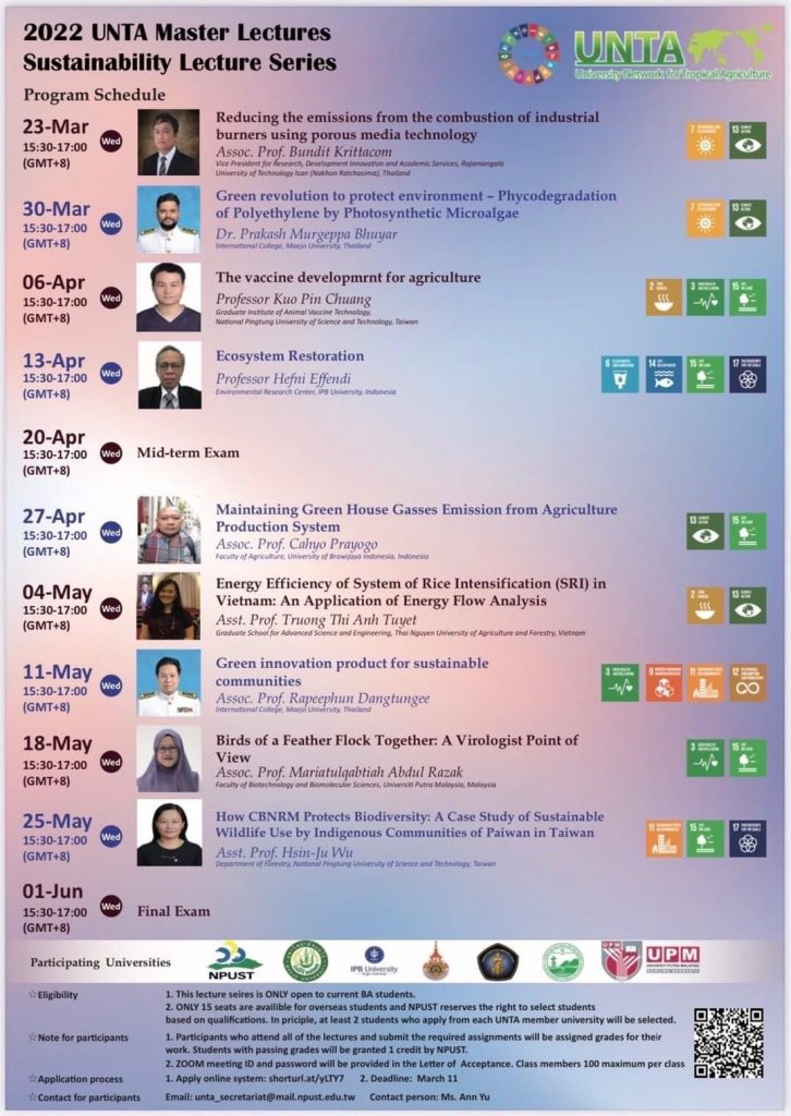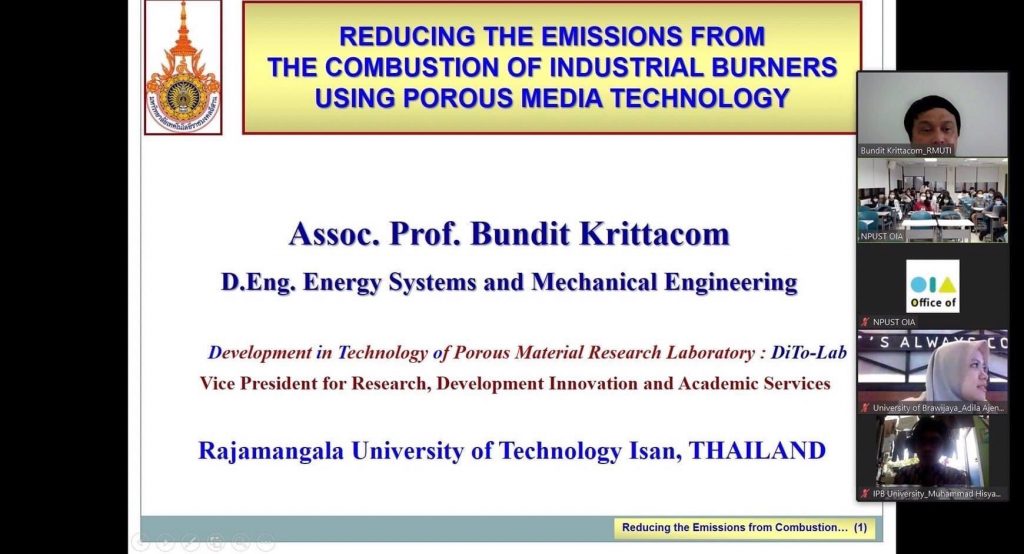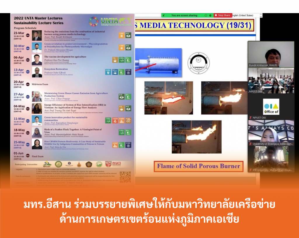 วันที่ 23 มีนาคม 2565 มทร.อีสาน โดย รศ.ดร.บัณฑิต กฤตาคม รองอธิการบดีฝ่ายวิจัยพัฒนานวัตกรรม และบริการวิชาการ เข้าร่วมบรรยายใน “the 3rd UNTA online lecture series” ซึ่งจัดโดย National Pingtung University of Science and Technology ประเทศไต้หวัน เพื่อแลกเปลี่ยนการเรียนการสอนโครงการ “Pressing Environmental issue” ในหัวข้อ “Reducing the emissions from the combustion of industrial burners using porous media technology” ซึ่งมีนักเรียนในพื้นที่ภูมิภาคเอเชียเข้าร่วมแลกเปลี่ยนการเรียนการสอนจำนวนกว่า 200 คน โดยงานดังกล่าวนี้ ได้มีการจัดขึ้นอย่างต่อเนื่องมาเป็นปีที่ 3 โดยทางมหาวิทยาลัยเทคโนโลยีราชมงคลอีสานเป็นหนึ่งในสมาชิกของ UNTA และจัดส่งบุคลากรเข้าร่วมบรรยายในทุก ๆ ครั้ง สำหรับในปีนี้นักศึกษาที่เข้าร่วมรับฟังจะสามารถเก็บสะสมหน่วยกิตในรายวิชาที่เกี่ยวข้องกับการพัฒนาที่ยังยืน (sustainability) ได้ ซึ่งนับว่าเป็นอีกหนึ่งเวทีในการเผยแพร่ความรู้ความเชี่ยวชาญของบุคลากรของมหาวิทยาลัยกับเป้าหมายเพื่อการพัฒนาที่ยั่งยืน (Sustainable Development Goals –SDGs) ขององค์การสหประชาชาติ