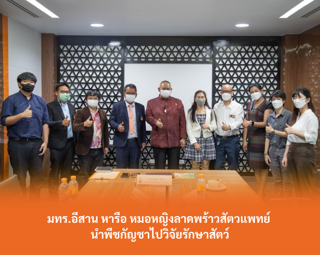 วันที่ 25 มีนาคม 2565 รศ.ดร.โฆษิต ศรีภูธร อธิการบดี มทร.อีสาน พร้อมกับคณะผู้บริหาร ร่วมหารือการศึกษาวิจัยการนำพืชกัญชาสายพันธุ์หางกระรอกและหางเสือไปใช้ในการดูแลสุขภาพและรักษาสัตว์ ร่วมกับ สัตวแพทย์หญิงจักราภรณ์ โพธิโกสุม ผู้บริหารหมอหญิงลาดพร้าวสัตวแพทย์ และกรรมการบริหาร บริษัทภารีฮวนน่า จำกัด พร้อมด้วย ผศ.น.สพ.ดร.กัมปนาท สุนทรวิภาต อาจารย์ประจำภาควิชาศัลยศาสตร์ คณะสัตวแพทย์ศาสตร์ จุฬาลงกรณ์มหาวิทยาลัย และคณะ ซึ่งเป็นการดำเนินงานภายใต้บันทึกความร่วมมือที่มีร่วมกัน เพื่อเป็นการสร้างองค์ความรู้และผลงานวิชาการเพื่อยืนยันคุณค่าและประโยชน์ของพืชกัญชาสายพันธุ์ไทยในเชิงประจักษ์ ซึ่งจะสามารถเพิ่มคุณค่าทางวิชาการและเพิ่มมูลค่าทางเศรษฐกิจได้ต่อไปในอนาคต