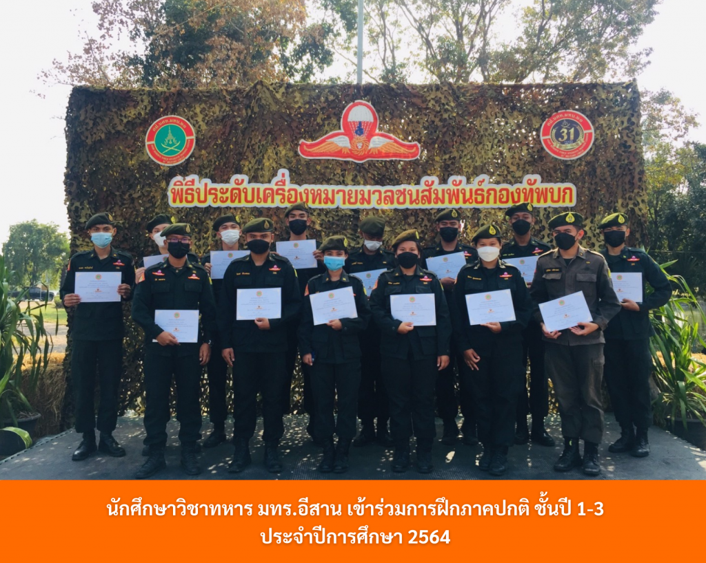 นักศึกษาวิชาทหาร มทร.อีสาน จำนวน 14 นาย เข้าร่วมการฝึกภาคปกติ ชั้นปี 1-3 ประจำปีการศึกษา 2564 เพื่อฝึกภาคปฎิบัติ โดยก่อนการเข้าฝึ วันที่ 27 มกราคม 2565 นักศึกษาเข้าตรวจ ATK ภายใต้มาตราการป้องกัน Covid-19 จากนั้นวันที่ 28 มกราคม 2565 ได้เข้ารับการฝึกบุคคลเบื้องต้น ณ มหาวิทยาลัยเทคโนโลยีสุรนารี และในวันที่ 29 มกราคม 2565 จึงเข้าร่วมการฝึกทดสอบกำลังใจ กระโดดหอสูง และเข้าร่วมพิธีประดับเครื่องหมาย และรับวุฒิบัตร พร้อมถ่ายภาพร่วมกัน ณ สวนน้ำบุ่งตาหลั่วเฉลิมพระเกียรติฯ ร.9 ค่าสุรนารี โดยมีผู้กับกำนักศึกษาวิชาทหาร มทร.อีสาน ผกท.รศ.ดร.บัณฑิต กฤษตาคม, ผกท.ดร.พลเทพ เวงสูงเนินผกท.หญิง ดารณี เปลื้อสันเทียะ เป็นผู้ดูแล