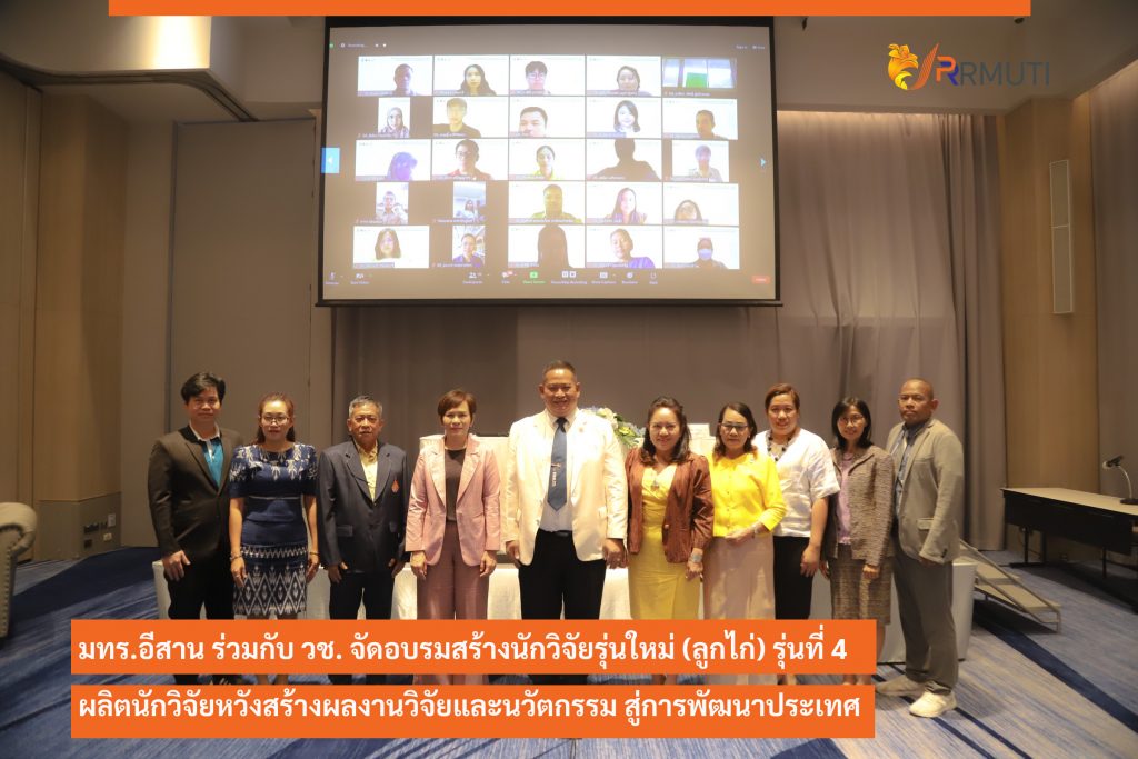 วันที่ 12 มิถุนายน 2566 มหาวิทยาลัยเทคโนโลยีราชมงคลอีสาน โดย สถาบันบริการวิชาการแห่งมหาวิทยาลัยเทคโนโลยีราชมงคลอีสาน ร่วมกับ สำนักงานการวิจัยแห่งชาติ (วช.) จัดโครงการฝึกอบรม“สร้างนักวิจัยรุ่นใหม่” (ลูกไก่) รุ่นที่ 4 ในรูปแบบออนไลน์ ผ่านระบบ Zoom Meeting ระหว่างวันที่ 12-16 มิถุนายน 2566 โดยถ่ายทอดสดจากโรงแรมเซนเตอร์พอยท์ อำเภอเมือง จังหวัดนครราชสีมา โดยมี นายสมปรารถนา สุขทวี รองผู้อำนวยการสำนักงานการวิจัยแห่งชาติ เป็นประธานกล่าวเปิดโครงการ มีรองศาสตราจารย์ ดร.โฆษิต ศรีภูธร อธิการบดีมหาวิทยาลัยเทคโนโลยีราชมงคลอีสาน ร่วมกล่าวต้อนรับ และ นางสาวจุฬาลักษณ์ พลเสนา ผู้อำนวยการสถาบันบริการวิชาการแห่งมหาวิทยาลัยเทคโนโลยีราชมงคลอีสาน กล่าวรายงานวัตถุประสงค์การจัดการอบรม