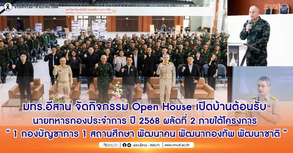 วันที่ 15 ธันวาคม 2568 มหาวิทยาลัยเทคโนโลยีราชมงคลอีสาน โดย รองศาสตราจารย์ ดร.โฆษิต ศรีภูธร อธิการบดี มอบหมายให้ ผู้ช่วยศาสตราจารย์ ดร.ระบิล พ้นภัย รองอธิการบดีฝ่ายวิชาการและวิเทศสัมพันธ์ พร้อมด้วย ผู้ช่วยศาสตราจารย์ ดร.เอนก เจริญภักดี รองอธิการบดีฝ่ายยุทธศาสตร์ นโยบายและแผน ผู้ช่วยศาสตราจารย์นัฐวุฒิ ทิพย์โยธา รองอธิการบดีฝ่ายส่งเสริมและพัฒนากิจการมหาวิทยาลัย รองศาสตราจารย์ ดร.ณรงค์ศักดิ์ โยธา ผู้ช่วยอธิการบดี อาจารย์ธนินทร์ ระเบียบโพธิ์ ผู้ช่วยอธิการบดี รองศาสตราจารย์ ดร.เชิดศักดิ์ สุขศิริพัฒนพงศ์ คณบดีคณะวิศวกรรมศาสตร์และเทคโนโลยี, อาจารย์ ดร.จิณณพัต โรจนวงศ์ ผู้อำนวยการสำนักส่งเสริมวิชาการและงานทะเบียน และคณาจารย์ เจ้าหน้าที่ ให้การต้อนรับ พลโท ปิยะพณห์ ฐิตวัฒนานนท์ แม่ทัพน้อยที่ 2 ประธานในพิธีเปิดกิจกรรม Open House เปิดบ้านมหาวิทยาลัยเทคโนโลยีราชมงคลอีสาน เพื่อประชาสัมพันธ์หลักสูตรเพิ่มวุฒิให้แก่ทหารกองประจำการ รุ่นปี 2568 ผลัดที่ 2 ภายใต้โครงการ “1 กองบัญชาการ 1 สถานศึกษาพัฒนาคน พัฒนากองทัพ พัฒนาชาติ” ซึ่งจัดโดยสำนักส่งเสริมวิชาการและงานทะเบียน พร้อมกันนี้ พลตรี ธนัชพงศ์ นันทสิริสิทธิ์ ผู้อำนวยการศูนย์พัฒนาการศึกษากองทัพภาคที่ 2 กล่าวรายงานวัตถุประสงค์ของการจัดกิจกรรม ณ หอประชุมวทัญญู ณ ถลาง มหาวิทยาลัยเทคโนโลยีราชมงคลอีสาน จังหวัดนครราชสีมาโดยมีนายทหารกองประจำการ รุ่นปี 2568 ผลัดที่ 2 เข้าร่วมกว่า 300 นาย