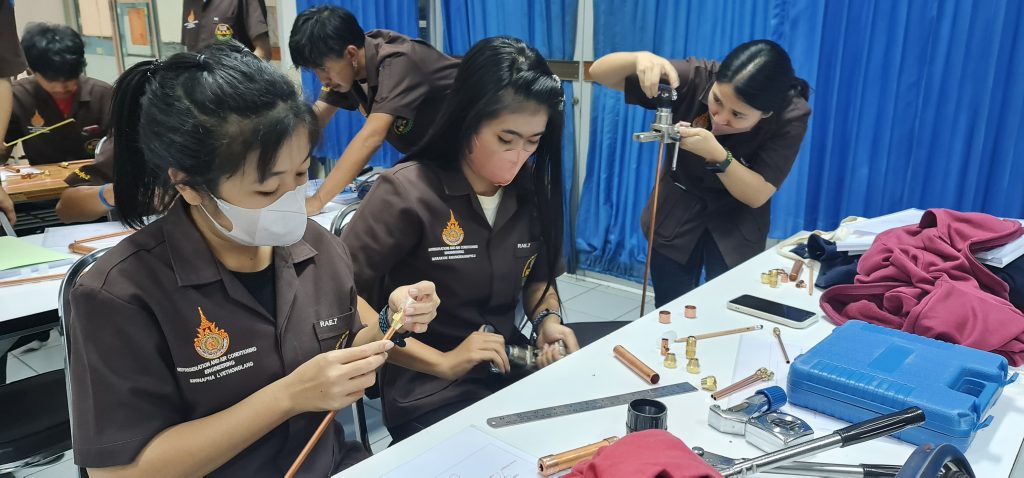 วันที่ 17-19 ธันวาคม 2565 ที่ผ่านมา มหาวิทยาลัยเทคโนโลยีราชมงคลอีสาน โดย สาขาวิศวกรรมพลังงานและการปรับอากาศ คณะวิศวกรรมศาสตร์และเทคโนโลยี ร่วมกับ สมาคมเครื่องทำความเย็นไทย และบริษัท สุปรีม ซี เอ็น บี คอปอเรชั่น จำกัด จัดโครงการฝึกอบรมเชิงปฏิบัติการเพื่อเพิ่มทักษะการปฏิบัติงานเกี่ยวกับสารทำความเย็นติดไฟได้ โดยมี ผู้ช่วยศาสตราจารย์ ดร.ธวัชชัย จารุวงศ์วิทยา อาจารย์ ดร.นิวัฒน์ เกตุชาติ อาจารย์นพรัตน์ อมัติรัตน์ และนักศึกษาสาขาวิชาวิศวกรรมการทำความเย็นและการปรับอากาศชั้นปีที่ 3 เข้าร่วมโครงการดังกล่าว จำนวน 45 คน โดยมีวัตถุประสงค์เพื่อให้นักศึกษามีความรู้ ความเข้าใจทั้งในภาคทฤษฎีและภาคปฏิบัติงานเกี่ยวกับสารทำความเย็นติดไฟได้อย่างปลอดภัยไม่เกิดอันตรายแก่ผู้ใช้งานและผู้ปฏิบัติงาน