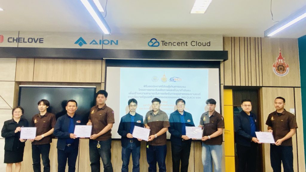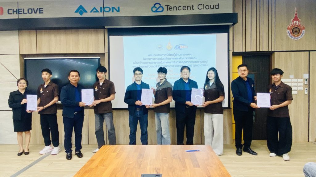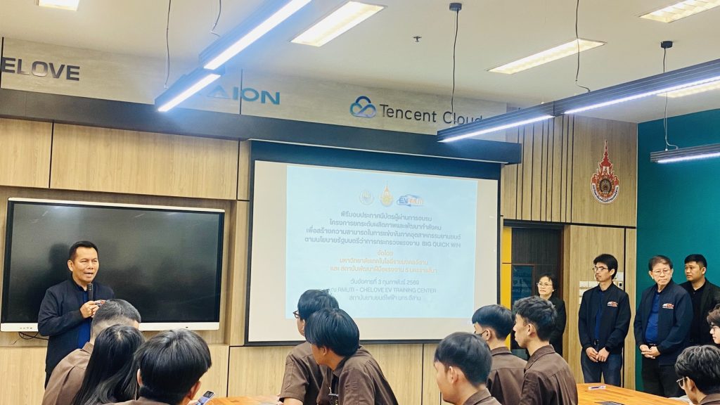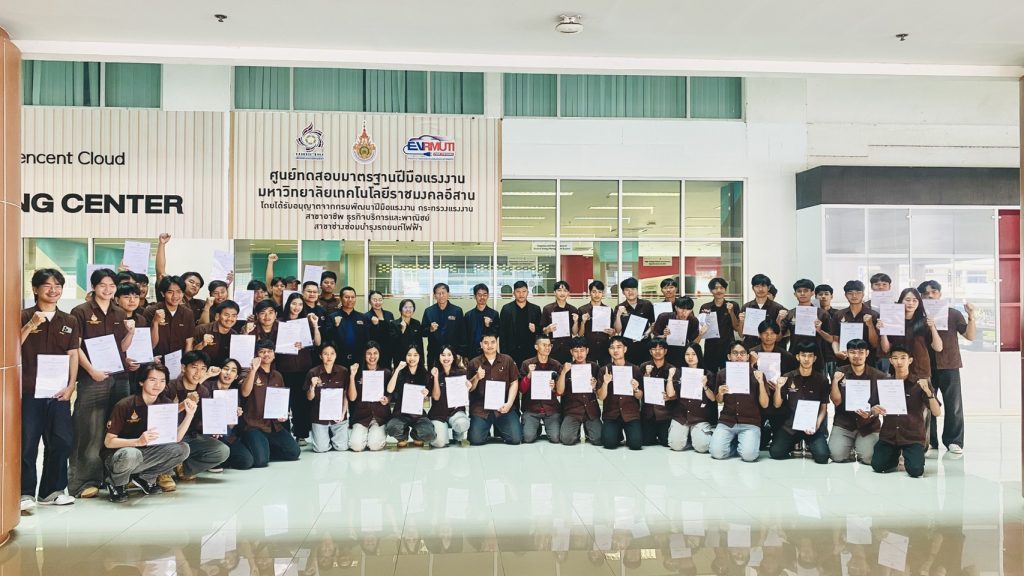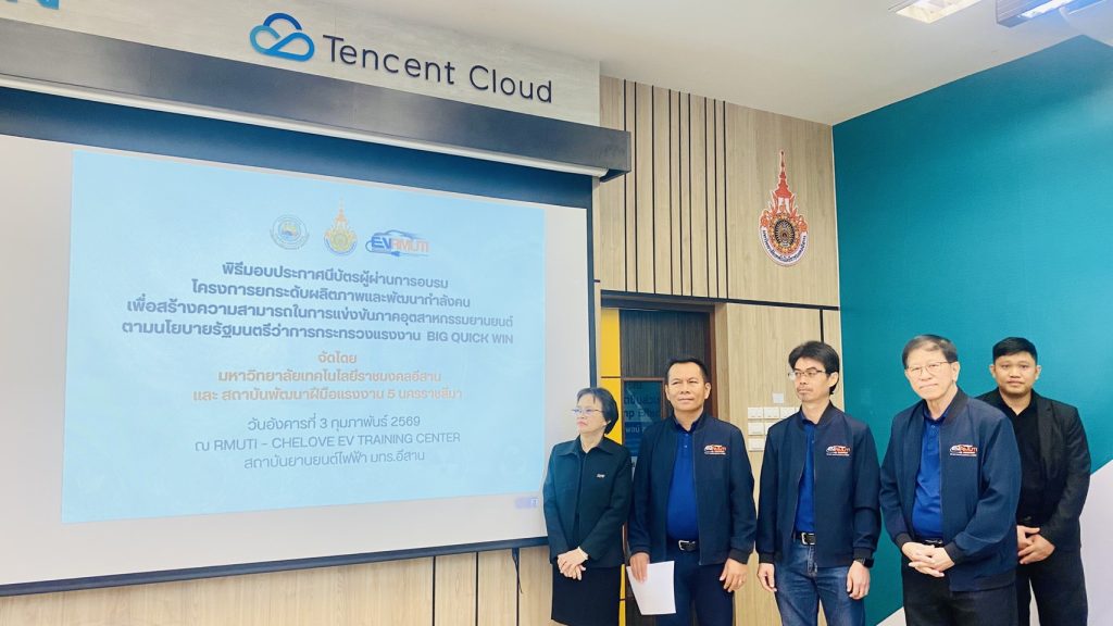 วันที่ 3 กุมภาพันธ์ 2569 มหาวิทยาลัยเทคโนโลยีราชมงคลอีสาน โดย รองศาสตราจารย์ ดร.โฆษิต ศรีภูธร อธิการบดี มอบหมายให้ ผู้ช่วยศาสตราจารย์ ดร.เอนก เจริญภักดี รองอธิการบดีฝ่ายยุทธศาสตร์ นโยบายและแผน กำกับดูแลยุทธศาสตร์ด้านยานยนต์ไฟฟ้า มทร.อีสาน พร้อมด้วย ผู้ช่วยศาสตราจารย์ ชูชัย ต.ศิริวัฒนา ที่ปรึกษาอธิการบดีด้านยานยนต์ไฟฟ้า อาจารย์ ดร.ประจวบ อินระวงค์ ผู้ช่วยอธิการบดี ปฏิบัติหน้าที่ผู้อำนวยการสถาบันยานยนต์ไฟฟ้า มทร.อีสาน และ ผู้ช่วยศาสตราจารย์ ดร.ติณกร ภูวดิน รองผู้อำนวยการสถาบันยานยนต์ไฟฟ้า มทร.อีสาน ฝ่ายบริหารและแผน ให้การต้อนรับ นางสาวนภาเพ็ญ ศรีศักดิ์ ผู้อำนวยการสถาบันพัฒนาฝีมือแรงงาน 5 นครราชสีมา ในพิธีปิดและพิธีมอบประกาศนียบัตรแก่ผู้ผ่านการอบรม “โครงการยกระดับผลิตภาพและพัฒนากำลังคนเพื่อสร้างความสามารถในการแข่งขันภาคอุตสาหกรรมยานยนต์” ตามนโยบายรัฐมนตรีว่าการกระทรวงแรงงาน (Quick Win) กรมพัฒนาฝีมือแรงงาน หลักสูตรการขับและบำรุงรักษารถยนต์ไฟฟ้า (EV) และหลักสูตรการบำรุงรักษารถจักรยานยนต์ระบบไฟฟ้า ณ สถาบันยานยนต์ไฟฟ้า RMUTI – CHELOVE EV TRAINING CENTER ชั้น 1 อาคารคณะวิศวกรรมศาสตร์และเทคโนโลยี มหาวิทยาลัยเทคโนโลยีราชมงคลอีสาน จังหวัดนครราชสีมา