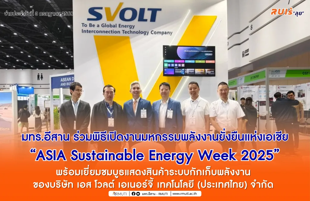 วันที่ 3 กรกฎาคม 2568 มหาวิทยาลัยเทคโนโลยีราชมงคลอีสาน โดย รองศาสตราจารย์ ดร.โฆษิต ศรีภูธร อธิการบดี มทร.อีสาน มอบหมายให้ ผู้ช่วยศาสตราจารย์ ดร.ระบิล พ้นภัย รองอธิการบดีฝ่ายวิชาการและวิเทศสัมพันธ์ เข้าร่วมพิธีเปิดงานมหกรรมพลังงานยั่งยืนแห่งเอเชีย “ASIA Sustainable Energy Week 2025” พร้อมเยี่ยมชมบูธแสดงสินค้าระบบกักเก็บพลังงาน ของบริษัท เอส โวลต์ เอเนอร์จี้ เทคโนโลยี (ประเทศไทย) จำกัด บริษัทที่มุ่งเน้นการทำผลิตภัตภัณฑ์และบริการด้านพลังงานสะอาดที่เป็นมิตรกับสิ่งแวดล้อม โดยมีสำนักงานใหญ่ในเมืองฉางโจว มณฑลเจียงซู ประเทศสาธารณรัฐประชาชนจีน ณ ศูนย์การประชุมแห่งชาติสิริกิติ์ (QSNCC) กรุงเทพมหานครฯ โดยภายในพิธีเปิด อินฟอร์มา มาเก็ตส์ พร้อมด้วยกระทรวงพลังงาน และภาคีเครือข่ายในทุกภาคส่วนร่วมกันเปิดงาน ASIA Sustainable Energy Week 2025 (ASEW) งานแสดงเทคโนโลยีและนวัตกรรมด้านพลังงานยั่งยืนแห่งเอเชีย เวทีที่ส่งเสริมความร่วมมือระหว่างภาครัฐ-เอกชน และเป็นกลไกขับเคลื่อนนโยบายพลังงานสะอาดระดับภูมิภาค โดยได้รวบรวมผู้เชี่ยวชาญ องค์กร และเครือข่ายด้านพลังงานจากทั่วโลกไว้ในเวทีเดียว โดยมีเป้าหมายร่วมกันเปลี่ยนผ่านสู่พลังงานสะอาด และ Net Zero อย่างเป็นรูปธรรม เพื่อยกระดับบทบาทของไทยสู่การเป็นศูนย์กลางนวัตกรรมพลังงานสะอาดของภูมิภาค