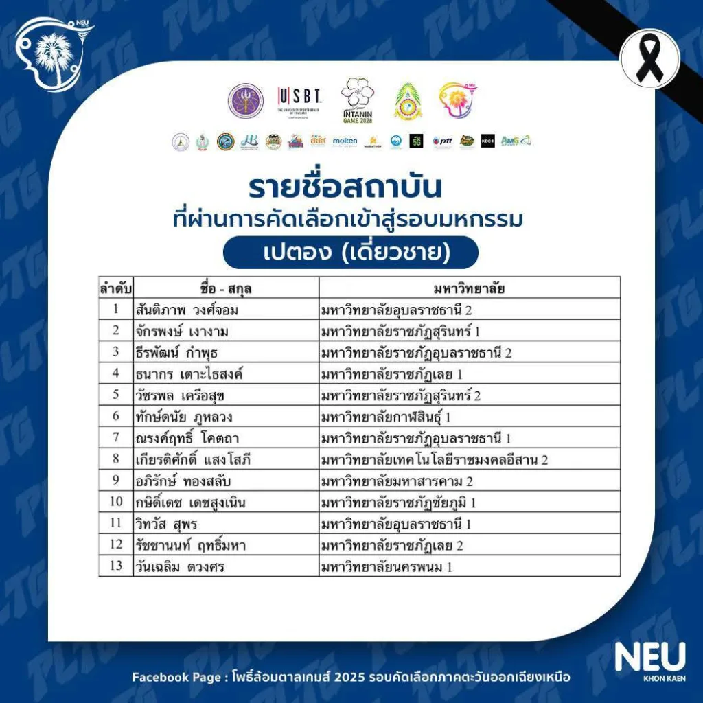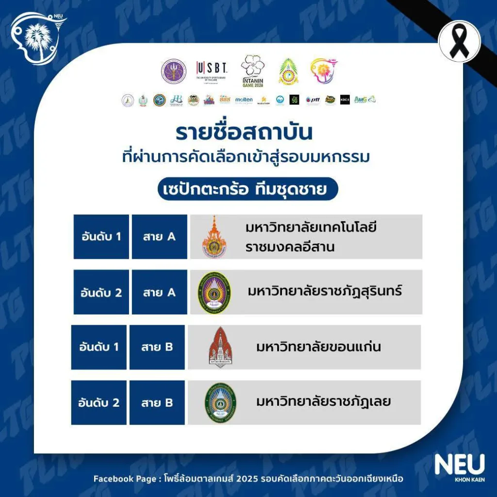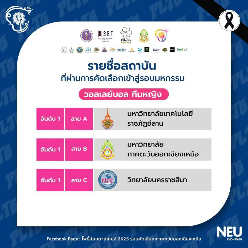 ผลปรากฎว่า นักกีฬา มทร.อีสาน ทำผลงานได้เยี่ยม ผ่านเข้ารอบ เพื่อเข้าร่วมมหกรรม “กีฬามหาวิทยาลัยแห่งประเทศไทย ครั้งที่ 51 “อินทนิลเกมส์” ซึ่งจะจัดขึ้นที่ มหาวิทยาลัยแม่โจ้ จังหวัดเชียงใหม่ ระหว่างวันที่ 9 – 19 มกราคม 2569 จำนวน 3 ชนิดกีฬา ดังนี้