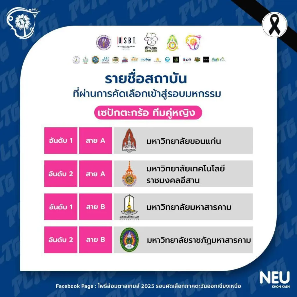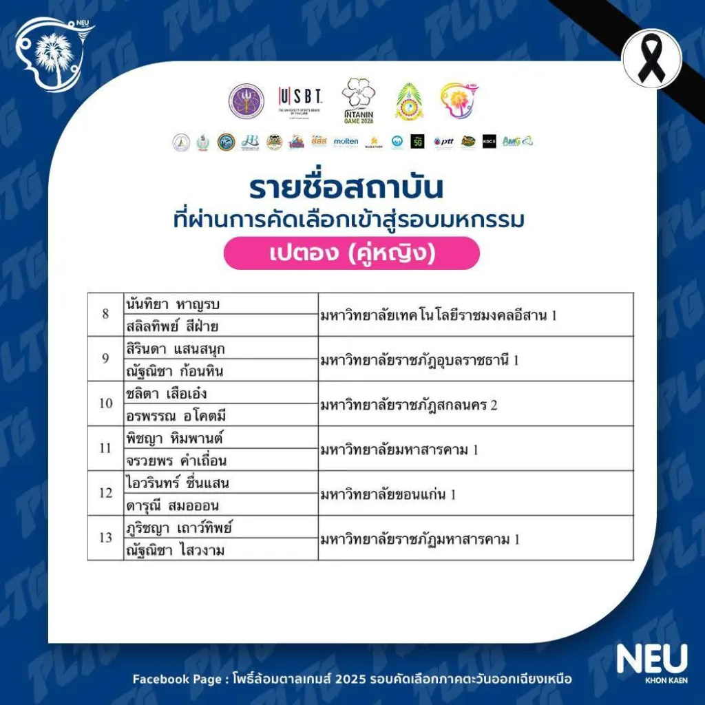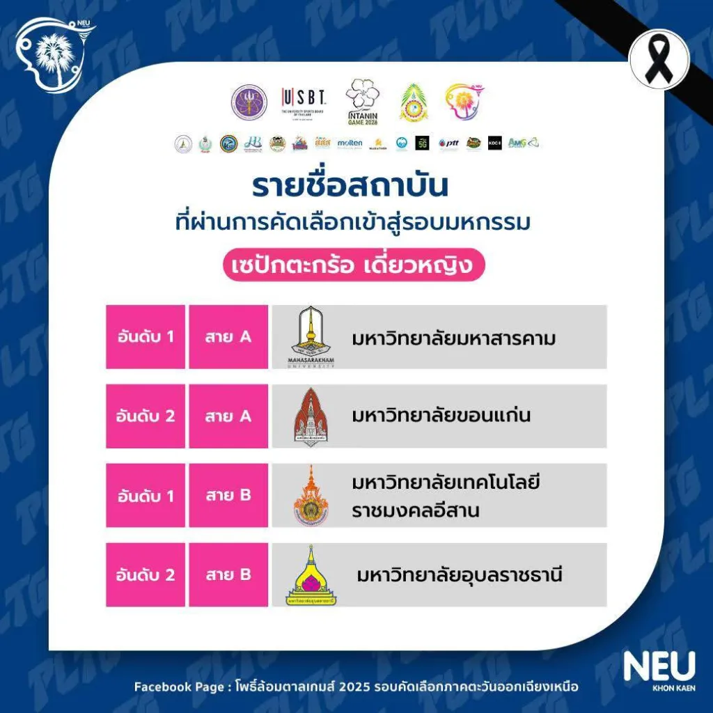 ผลปรากฎว่า นักกีฬา มทร.อีสาน ทำผลงานได้เยี่ยม ผ่านเข้ารอบ เพื่อเข้าร่วมมหกรรม “กีฬามหาวิทยาลัยแห่งประเทศไทย ครั้งที่ 51 “อินทนิลเกมส์” ซึ่งจะจัดขึ้นที่ มหาวิทยาลัยแม่โจ้ จังหวัดเชียงใหม่ ระหว่างวันที่ 9 – 19 มกราคม 2569 จำนวน 3 ชนิดกีฬา ดังนี้