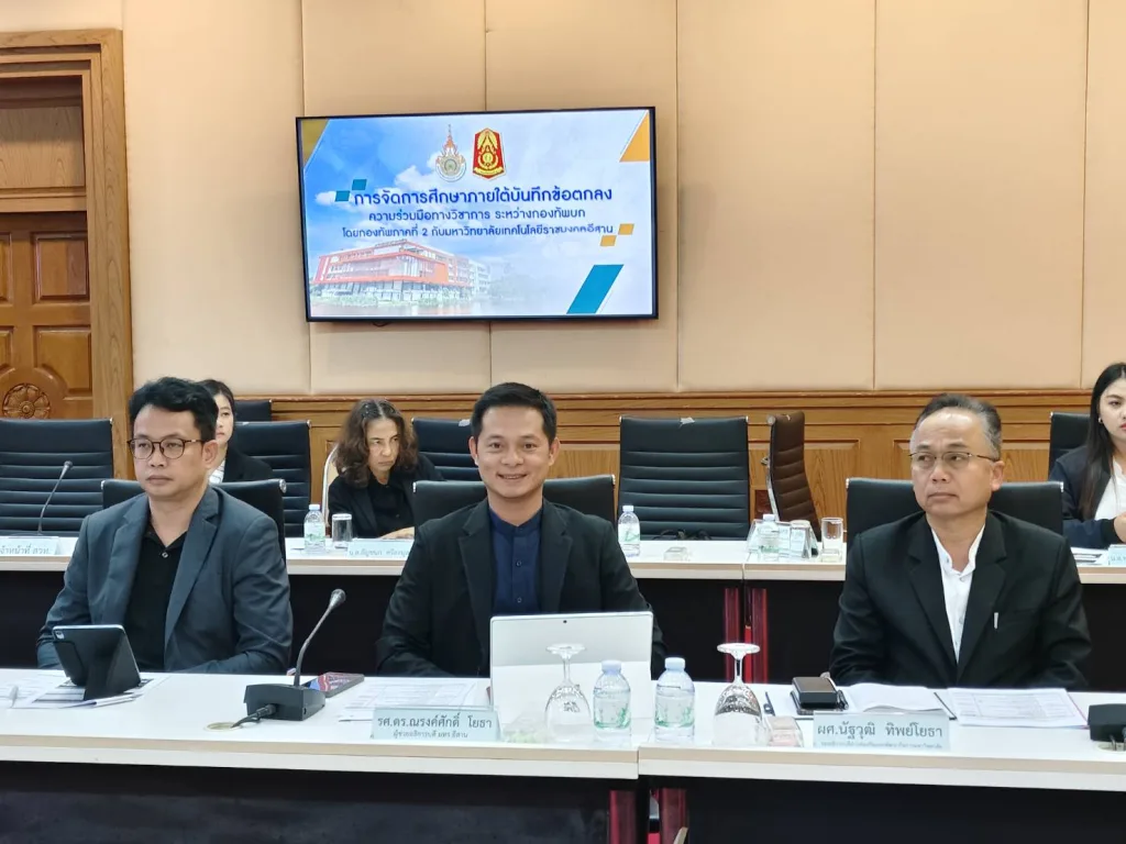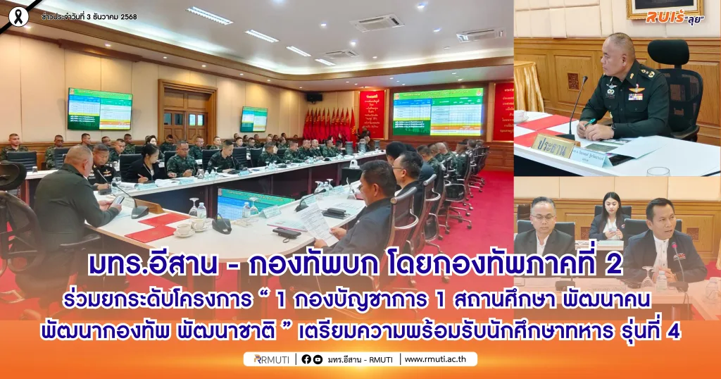 โครงการ “1 กองบัญชาการ 1 สถานศึกษา พัฒนาคน พัฒนากองทัพ พัฒนาชาติ” เป็นความร่วมมือสำคัญระหว่างกองทัพบก โดยกองทัพภาคที่ 2และมหาวิทยาลัยเทคโนโลยีราชมงคลอีสาน ที่เริ่มต้นจากเจตนารมณ์ร่วมในการยกระดับศักยภาพกำลังพล พัฒนาวิชาชีพ และสร้างโอกาสทางการศึกษาแก่ทหารประจำการและบุคลากรในระบบความมั่นคง การประชุมในครั้งนี้มุ่งเน้นการเตรียมความพร้อมสำหรับการเปิดรับสมัครนักศึกษาใน หลักสูตรเพิ่มวุฒิการศึกษา รุ่นที่ 4 โดยกำหนดแนวทางร่วมกันด้านรูปแบบการเรียนรู้ การนิเทศวิชาการ ระบบสนับสนุน การดำเนินการตามมาตรฐานคุณวุฒิ และการประสานงานระหว่างหน่วยงาน เพื่อให้ผู้เรียนได้รับคุณภาพการศึกษาที่เทียบเท่ามาตรฐานระดับชาติ การประชุมในวันนี้จึงไม่เพียงเป็นการเตรียมความพร้อมสำหรับรุ่นที่ 4 เท่านั้น แต่เป็นการวางรากฐานของการเปลี่ยนผ่านครั้งสำคัญ ที่จะทำให้กำลังพลของชาติสามารถเข้าถึงการศึกษาที่มีคุณภาพ มีโอกาสพัฒนาตนเอง และมีความพร้อมในการเผชิญกับการเปลี่ยนแปลงของสังคมในอนาคต ตอกย้ำบทบาทของมหาวิทยาลัยเทคโนโลยีราชมงคลอีสาน เพื่อสร้างสังคมแห่งโอกาส ความรู้ และความมั่นคงอย่างยั่งยืน