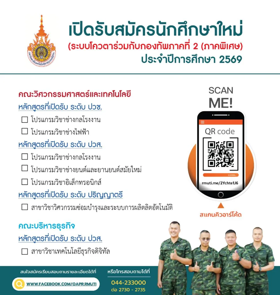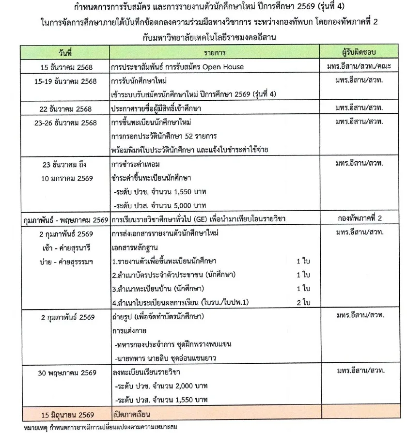 ปีการศึกษา 2569 มหาวิทยาลัยเทคโนโลยีราชมงคลอีสาน ได้ประกาศเปิดรับสมัครนักศึกษาใหม่ภายใต้ “ระบบโควตาร่วมกับกองทัพภาคที่ 2 (ภาคพิเศษ)” เพื่อรองรับผู้ที่สนใจศึกษาต่อในระดับ ปวช. ปวส. และปริญญาตรี โดยมุ่งเน้นหลักสูตรที่ตอบโจทย์การปฏิบัติงานของกำลังพลยุคใหม่ เช่น โปรแกรมวิชาช่างกลโรงงาน ช่างไฟฟ้า อิเล็กทรอนิกส์ ช่างยนต์สมัยใหม่ ตลอดจนสาขาวิศวกรรมอุตสาหการ มุ่งผลิตบุคลากรที่มีสมรรถนะด้านเทคนิคและวิศวกรรมรองรับภารกิจของกองทัพบกมหาวิทยาลัยยังได้ออกประกาศ “กำหนดการรับสมัครและรายงานตัวนักศึกษาใหม่ ปีการศึกษา 2569 (รุ่นที่ 4)” ซึ่งเป็นส่วนหนึ่งของการขับเคลื่อนโครงการ 1 กองบัญชาการ 1 สถานศึกษา ดังนี้