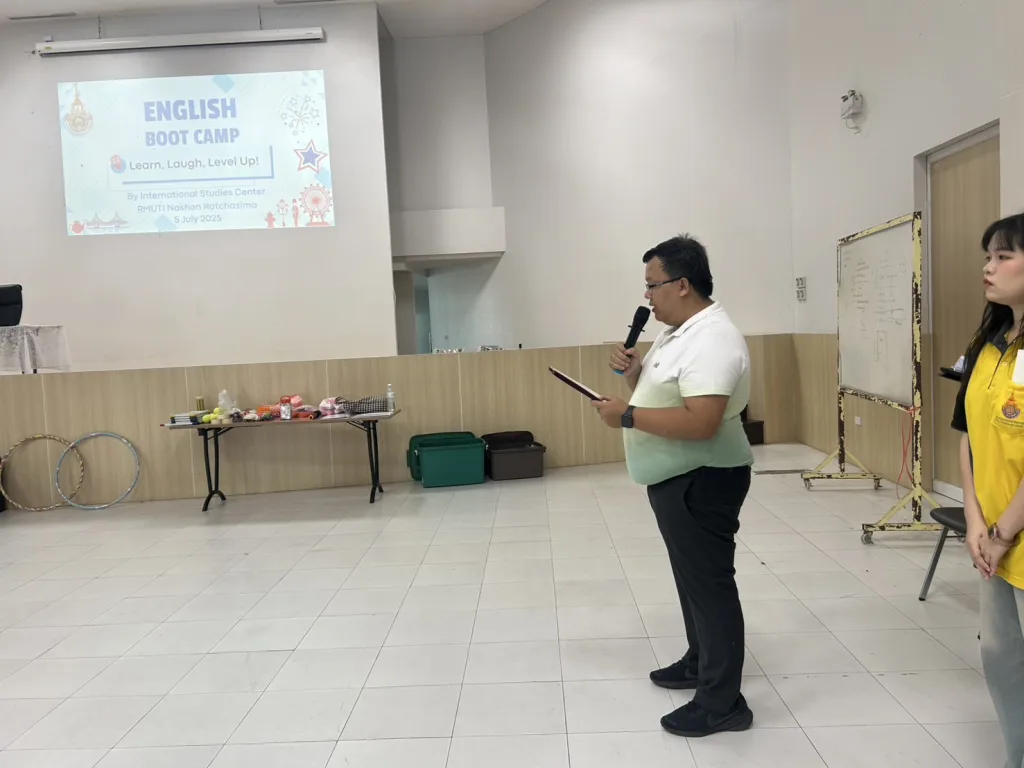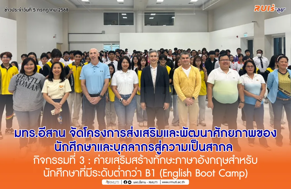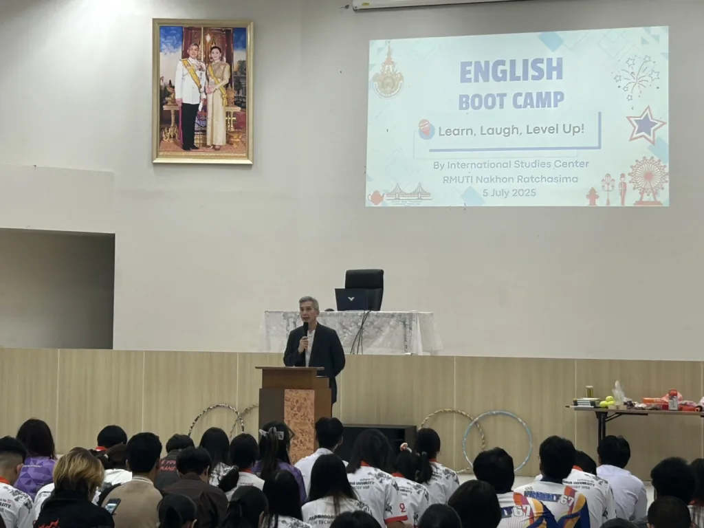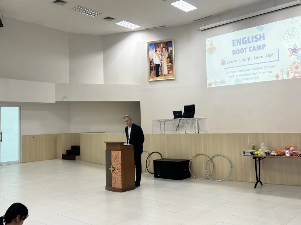 วันที่ 5 กรกฎาคม 2568 มหาวิทยาลัยเทคโนโลยีราชมงคลอีสาน โดย รองศาสตราจารย์ ดร.โฆษิต ศรีภูธร อธิการบดี มทร.อีสาน มอบหมายให้ ผู้ช่วยศาสตราจารย์ ดร.ระบิล พ้นภัย รองอธิการบดีฝ่ายวิชาการและวิเทศสัมพันธ์ เป็นประธานเปิด โครงการส่งเสริมและพัฒนาศักยภาพของนักศึกษาและบุคลากรสู่ความเป็นสากล กิจกรรมที่ 3 : ค่ายเสริมสร้างทักษะภาษาอังกฤษสำหรับนักศึกษาที่มีระดับต่ำกว่า B1 (English Boot Camp) ณ ห้อง 37-401 ชั้น 4 อาคาร 37 คณะสถาปัตยกรรมศาสตร์และศิลปกรรมสร้างสรรค์ มทร.อีสาน นครราชสีมา โดยมี อาจารย์ ดร.สุริยาวุธ สุวรรณบุบผา หัวหน้าศูนย์ศึกษานานาชาติ กล่าวรายงานวัตถุประสงค์โครงการส่งเสริมและพัฒนาศักยภาพฯ กิจกรรมที่ 2 ซึ่งภายในงานมีการบรรยายเรื่อง “การใช้คำศัพท์และถ้อยคำสำนวนในการเดินทางท่องเที่ยว (Travel)” “การพูดสนทนากับชาวต่างชาติในการเดินทางท่องเที่ยว (Travel)” “การเขียนแผนการเดินทางท่องเที่ยวในฝัน (My Dream Trip)” และ “การพูดนำเสนอแผนการเดินทางท่องเที่ยวในฝัน (My Dream Trip)” โดยได้รับเกียรติจาก อาจารย์หรินทร์ บริลลี่ย์ เป็นวิทยากรบรรยายให้ความรู้แก่ผู้เข้าร่วมอบรม