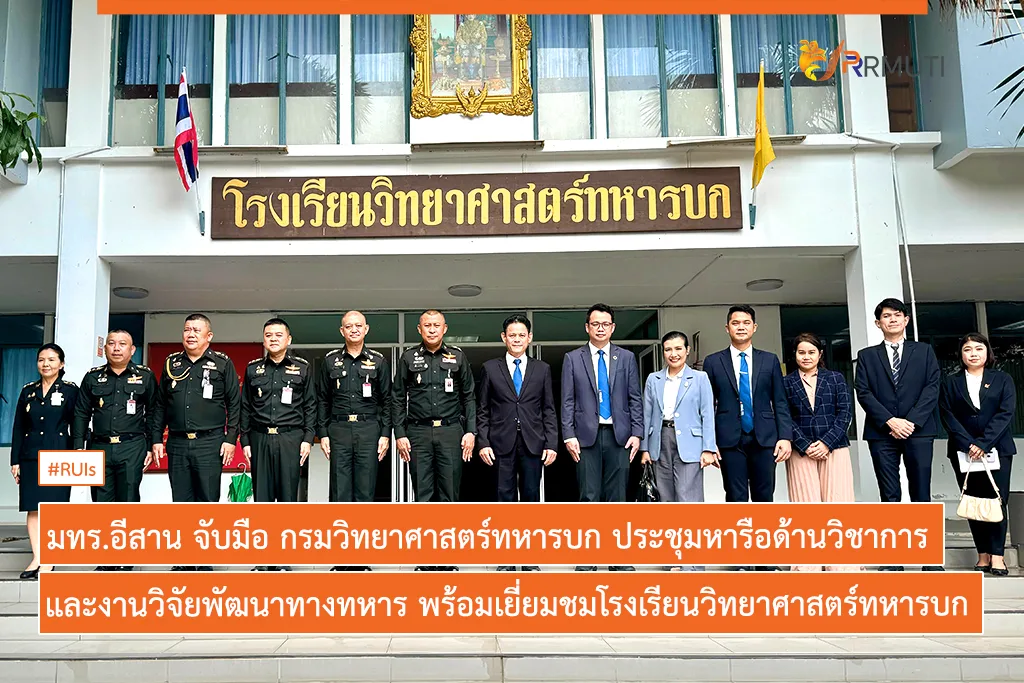 วันที่ 7 สิงหาคม 2567 มหาวิทยาลัยเทคโนโลยีราชมงคลอีสาน โดย รองศาสตราจารย์ ดร.โฆษิต ศรีภูธร อธิการบดี มทร.อีสาน มอบ รองศาสตราจารย์ ดร.ณรงค์ศักดิ์ ธรรมโชติ รองอธิการบดีฝ่ายวิชาการและวิเทศสัมพันธ์ พร้อมด้วย อาจารย์ ดร.จารุพงษ์ บรรเทา ผู้ช่วยอธิการบดี ผู้ช่วยศาสตราจารย์ ดร.พลเทพ เวงสูงเนิน คณบดีสถาบันสหสรรพศาสตร์ ผู้ช่วยศาสตราจารย์ ดร.ณัฏฐ์ชยธร วัทธิกรสิริกุล อาจารย์ประจำคณะระบบรางและการขนส่ง อาจารย์ ดร.สิริกานต์ ไชยสิทธิ์ หัวหน้าศูนย์พัฒนาอาจารย์สู่ความเป็นเลิศ และอาจารย์ ดร.วิจัย บุญญานุสิทธิ์ รองหัวหน้าศูนย์พัฒนาอาจารย์สู่ความเป็นเลิศ ด้านพัฒนาอาจารย์ด้านวิชาการ เข้าร่วมประชุมหารือด้านวิชาการและงานวิจัยพัฒนาทางทหาร พร้อมเยี่ยมชมโรงเรียนวิทยาศาสตร์ทหารบก โดยมี พล.ต.เรืองศักดิ์ แก่นกำจร เจ้ากรมวิทยาศาสตร์ทหารบก และคณะฯให้การต้อนรับ ณ ห้องประชุมพิเคราะห์สรรพกิจ กรมวิทยาศาสตร์ทหารบก กรุงเทพมหานคร