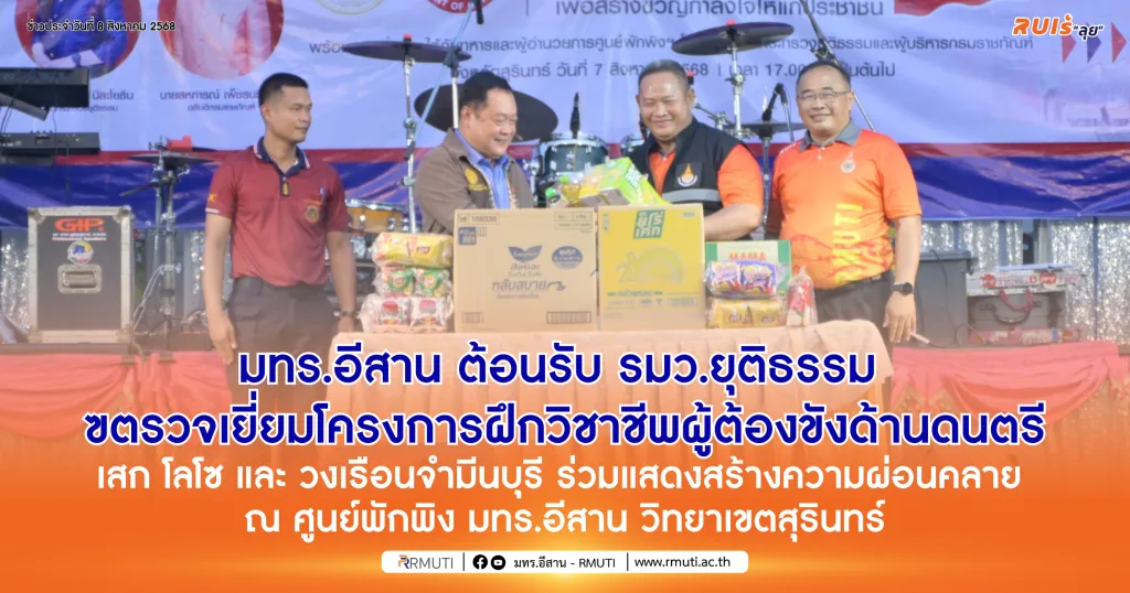 วันที่ 7 สิงหาคม 2568 มหาวิทยาลัยเทคโนโลยีราชมงคลอีสาน นำโดย รองศาสตราจารย์ ดร.โฆษิต ศรีภูธร อธิการบดี มทร.อีสาน, รองศาสตราจารย์ ดร.สำเนาว์ เสาวกูล รองอธิการบดีประจำวิทยาเขตสุรินทร์, ผู้ช่วยศาสตราจารย์ ดร.เอนก เจริญภักดี รองอธิการบดีฝ่ายยุทธศาสตร์ นโยบายและแผน และ ผู้ช่วยศาสตราจารย์ นัฐวุฒิ ทิพย์โยธา รองอธิการบดีฝ่ายส่งเสริมและพัฒนากิจการมหาวิทยาลัย ให้การต้อนรับ พันตำรวจเอก ทวี สอดส่อง รัฐมนตรีว่าการกระทรวงยุติธรรม ในโอกาสเป็นประธานตรวจเยี่ยม “โครงการฝึกวิชาชีพผู้ต้องขังที่ต้องโทษพิเศษด้านดนตรีและการแสดง” ณ ศูนย์พักพิงชั่วคราว จังหวัดสุรินทร์ โดยมี นายชำนาญ ชื่นตา ผู้ว่าราชการจังหวัดสุรินทร์, นายวสันต์ ชิงชนะ นายวีระชัย ประเสริฐโส รองผู้ว่าราชการจังหวัดสุรินทร์ พร้อมประชาสัมพันธ์จังหวัด และหัวหน้าส่วนราชการ ร่วมให้การต้อนรับในครั้งนี้ด้วย
