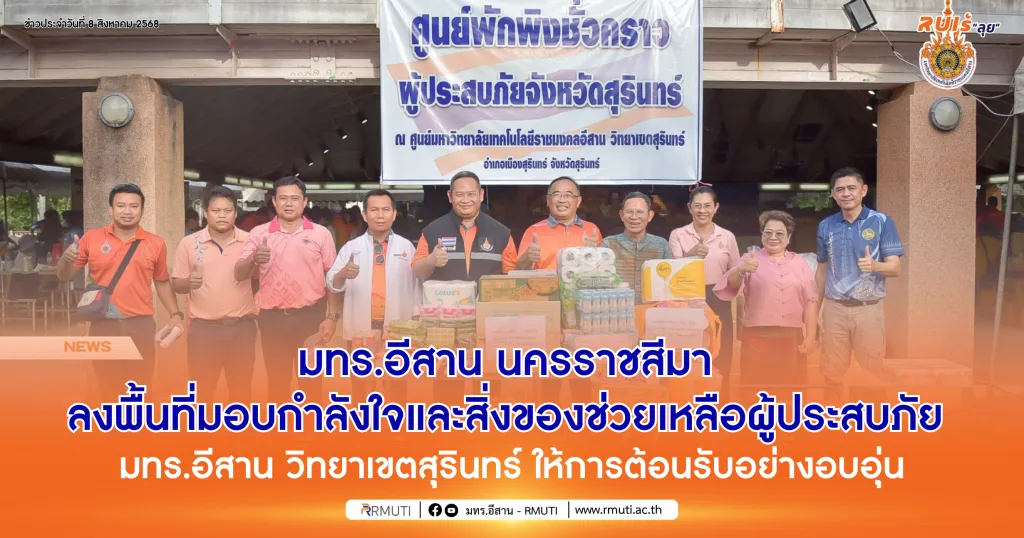 วันที่ 7 สิงหาคม 2568 มหาวิทยาลัยเทคโนโลยีราชมงคลอีสาน นครราชสีมา นำโดย รองศาสตราจารย์ ดร.โฆษิต ศรีภูธร อธิการบดี พร้อมด้วย ผู้ช่วยศาสตราจารย์ ดร.เอนก เจริญภักดี รองอธิการบดีฝ่ายยุทธศาสตร์ นโยบายและแผน, ผู้ช่วยศาสตราจารย์ นัฐวุฒิ ทิพย์โยธา รองอธิการบดีฝ่ายส่งเสริมและพัฒนากิจการมหาวิทยาลัย และ อาจารย์ ดร.โสภิดา สัมปัตติกร ผู้ช่วยอธิการบดี เดินทางไปยังจังหวัดสุรินทร์ เพื่อมอบสิ่งของบริจาคและให้กำลังใจแก่บุคลากรและเจ้าหน้าที่ประจำศูนย์อพยพ รวมถึงผู้ประสบภัยจากเหตุการณ์ความไม่สงบชายแดน ในการนี้ มหาวิทยาลัยเทคโนโลยีราชมงคลอีสาน วิทยาเขตสุรินทร์ นำโดย รองศาสตราจารย์ ดร.สำเนาว์ เสาวกูล รองอธิการบดีประจำวิทยาเขตสุรินทร์ ให้การต้อนรับคณะผู้บริหารจากนครราชสีมาอย่างอบอุ่น พร้อมร่วมลงพื้นที่เพื่อให้ความช่วยเหลืออย่างใกล้ชิด