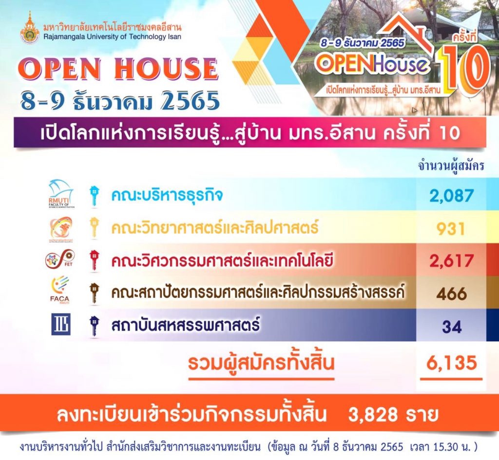 รองศาสตราจารย์ ดร.โฆษิต ศรีภูธร อธิการบดี มทร.อีสาน เปิดเผยว่า สำหรับกิจกรรมเปิดโลกแห่งการเรียนรู้สู่บ้าน มทร.อีสาน ในปีนี้ ได้กลับมาจัดกิจกรรมแบบ Onsite ปกติแล้ว หลังจากรัฐบาลมีนโยบายผ่อนคลายมาตรการเนื่องจากสถานการณ์การแพร่ระบาดของโควิด-19 ทำให้ในปีนี้มีนักเรียนและนักศึกษาเข้าร่วมงานจำนวนมากกว่า 3,828 คน และมียอดผู้สมัครวันแรกจำนวนมากถึง 6,135 คน ซึ่งคณะฯ ได้จัดเตรียมบูธแสดงหลักสูตร พร้อมแสดงจุดเด่นทั้งอุปกรณ์ และนวัตกรรม ที่ใช้ในการเรียนการสอนของมหาวิทยาลัยอย่างเต็มที่ โดยจัดกิจกรรม ณ อาคารของคณะต่างๆ และในหอประชุมวทัญญู ณ ถลาง มีการออกบูธของสถาบันสหสรรพศาสตร์ วิทยาลัยนวัตกรรมวิชาชีพ สำหรับการเปิดรับสมัครรอบ Open House ปีนี้ ทางมหาวิทยาลัยมีโควตาให้นักเรียนระดับ ม.6/ประกาศนียบัตรวิชาชีพ (ปวช.)/ประกาศนียบัตรวิชาชีพชั้นสูง (ปวส.) ในรอบนี้มากถึง 1,700 คน