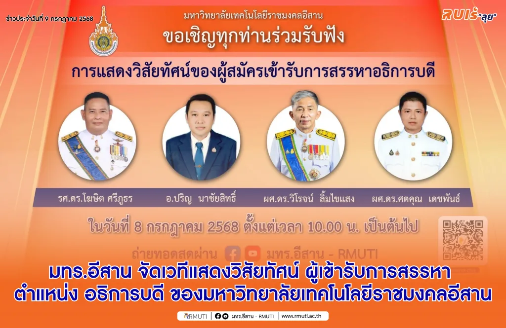 วันที่ 8 กรกฎาคม 2568 มหาวิทยาลัยเทคโนโลยีราชมงคลอีสาน จัดเวทีแสดงวิสัยทัศน์ ผู้สมัครเข้ารับการสรรหาเพื่อดำรงตำแหน่งอธิการบดีมหาวิทยาลัยเทคโนโลยีราชมงคลอีสาน ตามประกาศคณะกรรมการสรรหาอธิการบดีมหาวิทยาลัยเทคโนโลยีราชมงคลอีสาน เรื่อง กำหนดหลักเกณฑ์และวิธีการสรรหาผู้สมควรดำรงตำแหน่งอธิการบดี มหาวิทยาลัยเทคโนโลยีราชมงคลอีสาน ลงวันที่ 30 พฤษภาคม พ.ศ. 2568