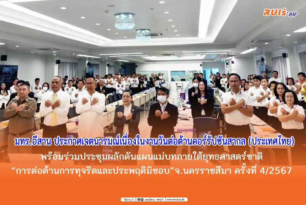 ทั้งนี้ ภายในการประชุมได้จัดพิธีมอบเกียรติบัตรเชิดชูเกียรติให้แก่หน่วยงานที่ได้รับผลการประเมินคุณธรรมและความโปร่งใสในการดําเนินงานของหน่วยงานภาครัฐ (Integrity and Transparency Assessment: ITA) ประจําปีงบประมาณ พ.ศ. 2567 ระดับ ผ่านดีเยี่ยม จํานวน 21 หน่วยงาน พร้อม รับชมการถ่ายทอดสดกิจกรรมวันต่อต้านคอร์รัปชันสากล(ประเทศไทย) “FIGHT AGAINST CORRUPTION สู้ให้สุด หยุด การโกง” และพิธีประกาศเจตจำนงต่อต้านการทุจริตโดย นางสาวแพทองธาร ชินวัตร นายกรัฐมนตรี ซึ่งถ่ายทอดจาก ณ ฮอลล์ 7 อาคารศูนย์การประชุม อิมแพ็ค เมืองทองธานี จังหวัดนนทบุรี โดยในการประกาศเจตนารมณ์ครั้งนี้ มหาวิทยาลัยเทคโนโลยีราชมงคลออีสาน ได้ร่วมประกาศเจตนารมณ์เนื่องในงานวันต่อต้านคอร์รัปชันสากล (ประเทศไทย) ร่วมกับหน่วยงานภาครัฐและภาคีเครือข่ายทั่วประเทศ พร้อมร่วมแสดงสัญลักษณ์การต่อต้านการทุจริตด้วย