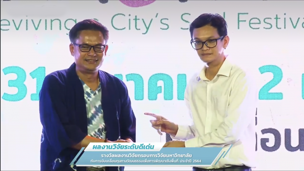 วันที่ 1 เมษายน 2566 มหาวิทยาลัยเทคโนโลยีราชมงคลอีสาน โดยสถาบันวิจัยและพัฒนา มทร.อีสาน เข้าร่วมงานมหกรรมทุนทางวัฒนธรรมฟื้นใจเมือง ณ ชุมชนเลื่อนฤทธิ์ ถนนเยาวราช กรุงเทพมหานคร ซึ่งจัดโดย หน่วยบริหารและจัดการทุนด้านการพัฒนาระดับพื้นที่ (บพท.) โดยในงานนี้ คณะผู้วิจัยของมทร.อีสาน ได้รับรางวัล “ผลงานวิจัยดีเด่น” จาก ผลงานโครงการการขับเคลื่อนเศรษฐกิจชุมชนในเมืองพิมายด้วยทุนทางวัฒนธรรม ซึ่งมี รองศาสตราจารย์ ดร.บัณฑิต กฤตาคม รองอธิการบดีฝ่ายวิจัย พัฒนานวัตกรรม และบริการวิชาการ เป็นหัวหน้าโครงการ (รองศาสตราจารย์ ดร.พิพัฒน์ อมตฉายา อดีตรองอธิการบดีฝ่ายวิจัยและบริการวิชาการ เป็นหัวหน้าโครงการในช่วงแรกของการดำเนินงาน) โดยมี อาจารย์วัลลภ ศรีสำราญ อาจารย์ประจำคณะสถาปัตยกรรมศาสตร์และศิลปกรรมสร้างสรรค์ เป็นผู้แทนคณะวิจัย เข้ารับรางวัล
