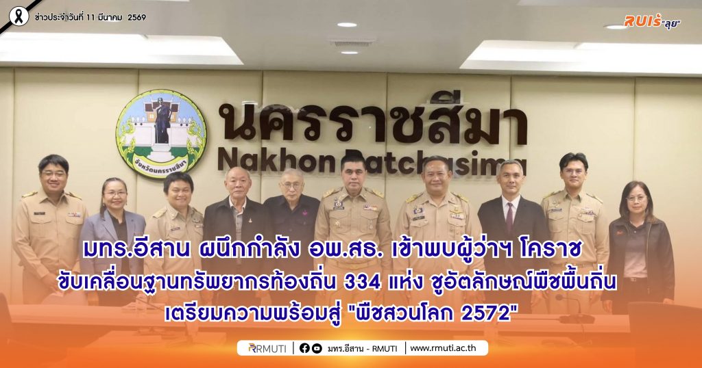 วันที่ 9 มีนาคม พ.ศ. 2569 มหาวิทยาลัยเทคโนโลยีราชมงคลอีสาน (มทร.อีสาน) โดย รองศาสตราจารย์ ดร.โฆษิต ศรีภูธร อธิการบดี มทร.อีสาน พร้อมด้วยคณะผู้บริหาร ได้แก่ รศ.ดร.บัณฑิต กฤตาคม รองอธิการบดีฝ่ายวิจัย พัฒนานวัตกรรม และบริการวิชาการ, รศ.ดร.อภิชิต คำภาหล้า คณบดีคณะระบบรางและการขนส่ง และ ผศ.ดร.กุณฑิกา บุญสุภาวงศ์ หัวหน้าศูนย์ประสานงาน อพ.สธ. – มทร.อีสาน รวมถึง พลตรี วิเชฏฐ์ ปุญญบาล ที่ปรึกษา อพ.สธ. – มทร.อีสาน นายพรชัย จุฑามาศ รองผู้อำนวยการโครงการอนุรักษ์พันธุกรรมพืชอันเนื่องมาจากพระราชดำริ สมเด็จพระเทพรัตนราชสุดา ฯ สยามบรมราชกุมารี ได้เข้าพบ นายอนุพงศ์ สุขสมนิตย์ ผู้ว่าราชการจังหวัดนครราชสีมา เพื่อหารือแนวทางการขับเคลื่อนโครงการอนุรักษ์พันธุกรรมพืชอันเนื่องมาจากพระราชดำริ สมเด็จพระเทพรัตนราชสุดาฯ สยามบรมราชกุมารี (อพ.สธ.) สนับสนุนการดำเนินงานของฐานทรัพยากรท้องถิ่นทั้ง 334 แห่ง พร้อมหารือวาง Roadmap จัดทำฐานข้อมูลพืชอัตลักษณ์ 32 อำเภอ มุ่งยกระดับทรัพยากรท้องถิ่นด้วยวิจัยและนวัตกรรม รองรับมหกรรมพืชสวนโลกปี 2572 ณ ศาลากลางจังหวัดนครราชสีมา