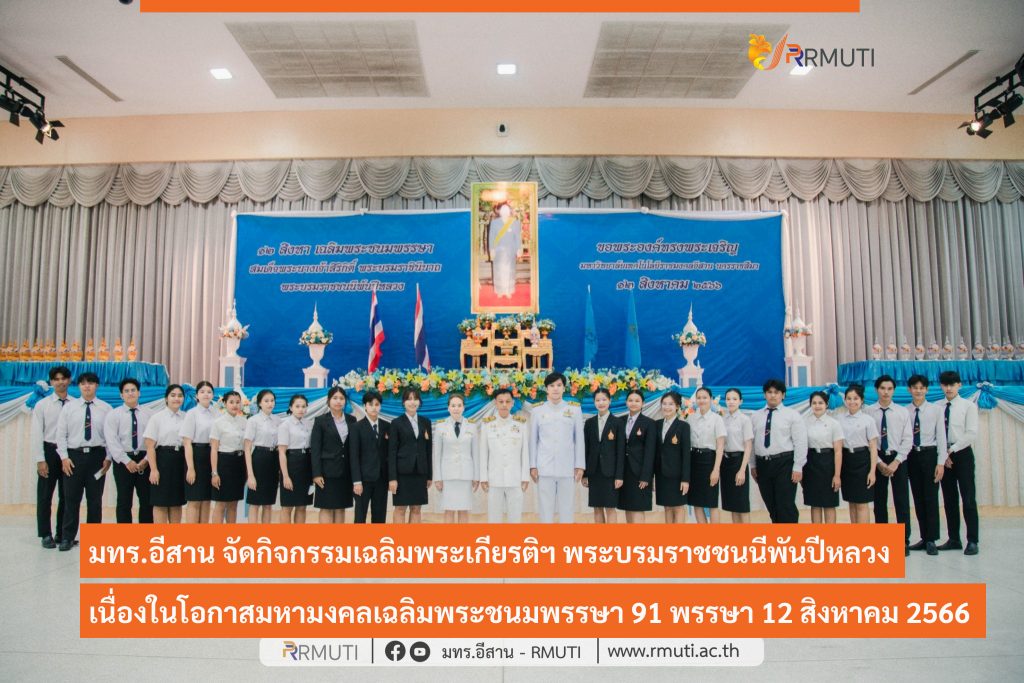 วันที่ 11 สิงหาคม 2565 มหาวิทยาลัยเทคโนโลยีราชมงคลอีสาน จัดกิจกรรมเฉลิมพระเกียรติ สมเด็จพระนางเจ้าสิริกิติ์ พระบรมราชินีนาถ พระบรมราชชนนี พระบรมราชชนนีพันปีหลวง เนื่องในโอกาสมหามงคลเฉลิมพระชนมพรรษา 91 พรรษา 12 สิงหาคม 2566 ณ หอประชุมวทัญญู ณ ถลาง มทร.อีสาน นครราชสีมา โดยมี ผู้ช่วยศาสตราจารย์สุรพจน์ วัชโรภากุล รองอธิการบดีฝ่ายบริหารและพัฒนาทรัพยากรมนุษย์ เป็นประธานในพิธี ซึ่งมีคณะผู้บริหาร อาจารย์ เจ้าหน้าที่ และนักศึกษา มทร.อีสาน เข้าร่วมพิธีอย่างพร้อมเพรียง