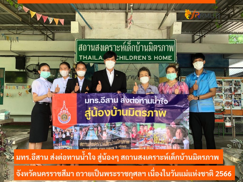 ทั้งนี้ มทร.อีสาน โดย กองพัฒนานักศึกษา จึงได้นำสิ่งของที่ได้จากการทำบุญมามอบให้แก่สถานสงเคราะห์เด็กบ้านมิตรภาพ ต.สูงเนิน อ.สูงเนิน จ.นครราชสีมา เพื่อนำไปใช้เป็นเครื่องอุปโภคบริโภค แก่เด็กๆ ในสถานสงเคราะห์ต่อไป โดยมี คุณจุฬาพร เอื้อวิศวกุล ผู้อำนวยการสถานสงเคราะห์เด็กบ้านมิตรภาพ เป็นผู้รับมอบสิ่งของ ซึ่งกิจกรรมดังกล่าวเป็นการร่วมสร้างโอกาสแก่เด็กๆ ซึ่งขาดแคลน และเพื่อถวายเป็นพระราชกุศล เนื่องในโอกาสอันเป็นมหามงคลวันเฉลิมพระชนมพรรษา สมเด็จพระนางเจ้าสิริกิติ์ พระบรมราชินีนาถ พระบรมราชชนนี พระบรมราชชนนีพันปีหลวง 12 สิงหาคม 2566