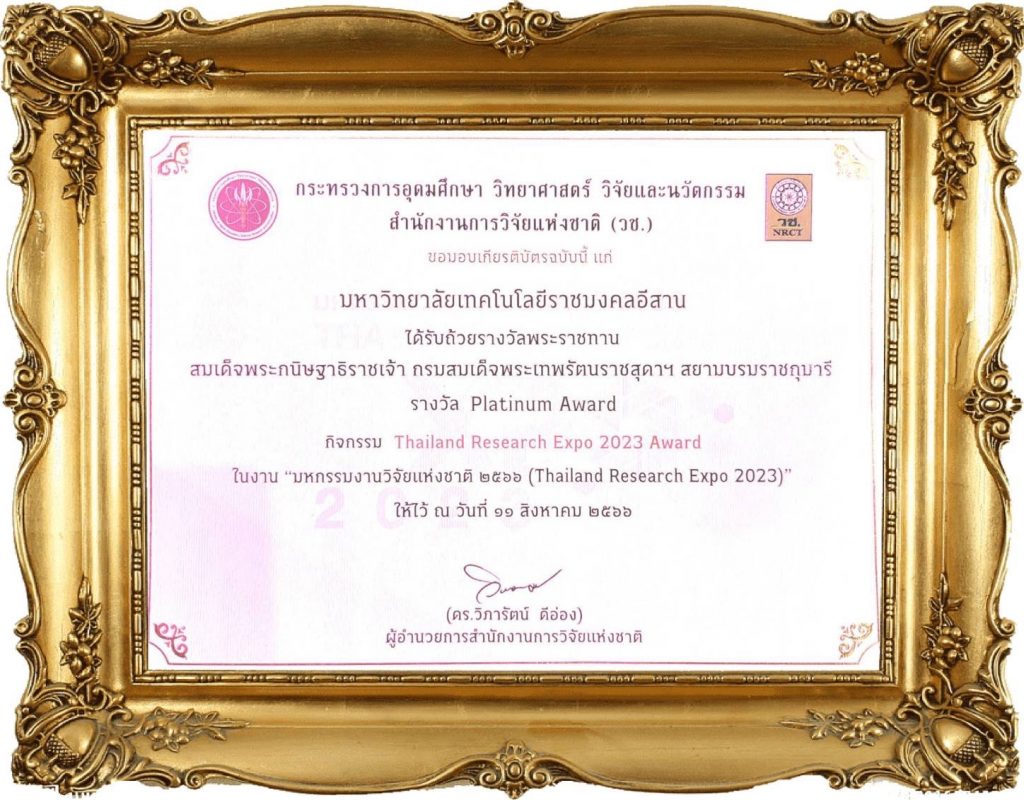 วันที่ 11 สิงหาคม 2566 มหาวิทยาลัยเทคโนโลยีราชมงคลอีสาน โดย รองศาสตราจารย์ ดร.โฆษิต ศรีภูธรอธิการบดี มทร.อีสาน ขึ้นรับได้รับถ้วยรางวัลพระราชทาน จาก สมเด็จพระกนิษฐาธิราชเจ้า กรมสมเด็จพระเทพรัตนราชสุดาฯ สยามบรมราชกุมารี “Platinum Award” ในงานมหกรรมงานวิจัยแห่งชาติ 2566 (Thailand Research Expo 2023) ณ โรงแรมเซ็นทาราแกรนด์ และบางกอกคอนเวนชันเซ็นเตอร์ เซ็นทรัลเวิลด์
