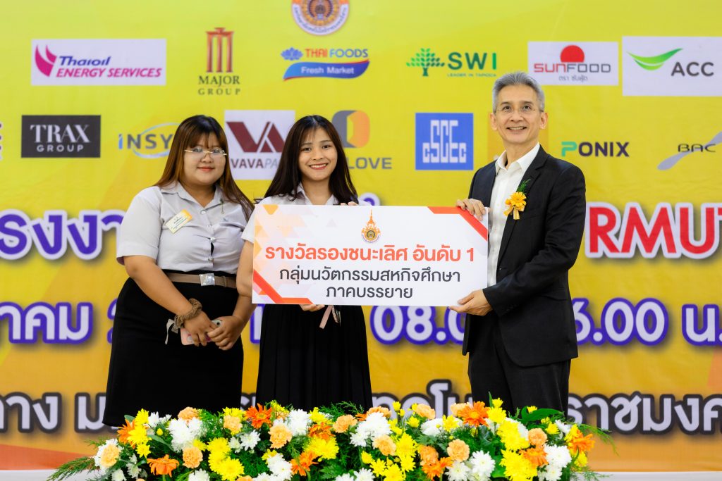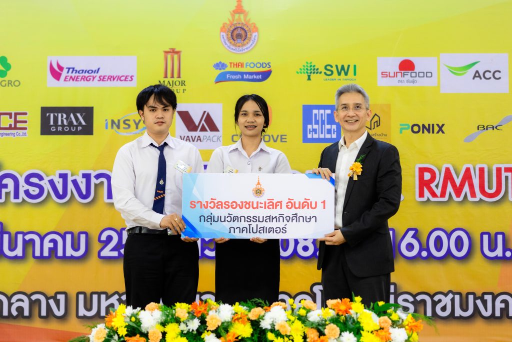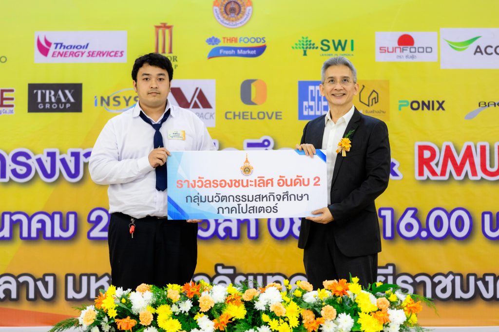 - รองชนะเลิศอันดับที่ 1 ได้แก่ ผลงาน “การออกแบบเชิงนวัตกรรมเพื่อยกระดับการทำงานระบบลำเลียงข้าวด้วยข้าว” โดย นางสาวทองอินทร์ ชัยวัติมย์ และนายอภินันท์ นพสันเทียะ นักศึกษาสาขาวิชาวิศวกรรมการผลิต คณะวิศวกรรมศาสตร์และเทคโนโลยี