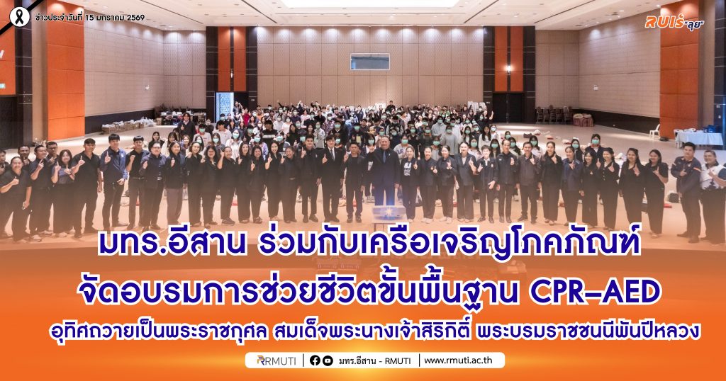 วันที่ 15 มกราคม 2569 มหาวิทยาลัยเทคโนโลยีราชมงคลอีสาน ร่วมกับ บริษัท เครือเจริญโภคภัณฑ์ จำกัด จัดโครงการฝึกอบรมการช่วยชีวิตขั้นพื้นฐาน เพื่ออุทิศถวายเป็นพระราชกุศล แด่สมเด็จพระนางเจ้าสิริกิติ์ พระบรมราชินีนาถ พระบรมราชชนนีพันปีหลวง ระหว่างวันที่ 15–16 มกราคม พ.ศ. 2569 ณ ห้องประชุมตะโกราย 2 อาคาร 35 สำนักส่งเสริมวิชาการและงานทะเบียน มหาวิทยาลัยเทคโนโลยีราชมงคลอีสาน อำเภอเมืองนครราชสีมา จังหวัดนครราชสีมา โดยมีคณะผู้บริหาร คณาจารย์ บุคลากร และนักศึกษาเข้าร่วมการอบรมเป็นจำนวนมาก ในการนี้ คุณวิโรจน์ สีกะสัง ผู้จัดการแผนกความปลอดภัย อาชีวอนามัยและสิ่งแวดล้อม บริษัท ซีพีเอฟ (ประเทศไทย) จำกัด (มหาชน) ในฐานะวิทยากรอาสาสมัครการช่วยชีวิตขั้นพื้นฐาน เครือเจริญโภคภัณฑ์ (CP CPR Volunteer) ได้กล่าวรายงานวัตถุประสงค์ของการจัดโครงการ และได้รับเกียรติจาก รองศาสตราจารย์ ดร.โฆษิต ศรีภูธร อธิการบดี มทร.อีสาน ให้เกียรติเป็นประธานกล่าวเปิดการอบรม โดยกล่าวถึงความสำคัญของการฝึกอบรมการช่วยชีวิตขั้นพื้นฐานและการใช้เครื่อง AED ว่าเป็นทักษะด้านการปฐมพยาบาลที่ทุกคนควรมี สามารถช่วยชีวิตผู้ประสบเหตุหมดสติ หยุดหายใจ หรือหัวใจหยุดเต้นอย่างกะทันหันได้อย่างทันท่วงที อีกทั้งยังเป็นการเสริมสร้างความปลอดภัยในการดำรงชีวิตประจำวันให้แก่ประชาชนในพื้นที่จังหวัดนครราชสีมา