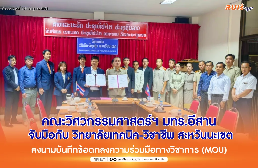 วันที่ 14 กรกฎาคม 2568 มหาวิทยาลัยเทคโนโลยีราชมงคลอีสาน โดย รองศาสตราจารย์ ดร.โฆษิต ศรีภูธร อธิการบดี มทร.อีสาน มอบหมายให้ ผู้ช่วยศาสตราจารย์ ดร.ศตคุณ เดชพันธ์ คณบดีคณะวิศวกรรมศาสตร์และเทคโนโลยี พร้อมด้วยคณะผู้บริหาร เดินทางไปราชการ ณ แขวงสะหวันนะเขต สาธารณรัฐประชาธิปไตยประชาชนลาว เพื่อร่วมลงนามบันทึกข้อตกลงความร่วมมือทางวิชาการกับ วิทยาลัยเทคนิค-วิชาชีพ สะหวันนะเขต ในโอกาสนี้ได้มีการประชุมหารือร่วมกับเขตเศรษฐกิจพิเศษแขวงสะหวันนะเขต เพื่อเตรียมความพร้อมในการพัฒนาบุคลากร และฝึกอบรมการใช้เครื่องมือที่เกี่ยวข้องกับการเรียนการสอนและเข้าสู่ภาคอุตสาหกรรม พร้อมทั้งศึกษาดูงานกับบริษัท MISUZU Lao ซึ่งเป็นบริษัท ที่เชี่ยวชาญในการผลิตสายไฟฟ้าและสายเคเบิลสำหรับการใช้งานด้านต่าง ๆ