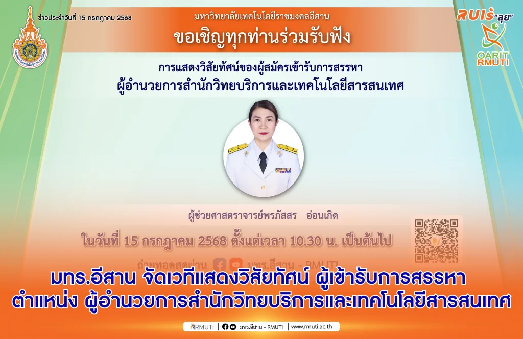 วันที่ 15 กรกฎาคม 2568 มหาวิทยาลัยเทคโนโลยีราชมงคลอีสาน จัดเวทีแสดงวิสัยทัศน์ ผู้สมัครเข้ารับการสรรหาเพื่อดำรงตำแหน่งผู้อำนวยการ สำนักวิทยบริการและเทคโนโลยีสารสนเทศ ตามที่ได้มีประกาศณะกรรมการสรรหาผู้อำนวยการสำนักวิทยบริการและเทคโนโลยีสารสนเทศ เรื่อง กำหนดหลักเกณฑ์และวิธีการสรรหาผู้อำนวยการสำนักวิทยบริการและเทคโนโลยีสารสนเทศ พ.ศ. 2568 ลงวันที่ 12 มิถุนายน พ.ศ. 2568 นั้น บัดนี้ มีผู้สมัครรวมทั้งสิ้น 1 ราย โดยคณะกรรมการสรรหาผู้อำนวยการสำนักวิทยบริการและและเทคโนโลยีสารสนเทศ ได้ตรวจสอบเอกสารและหลักฐานการสมัครและคุณสมบัติเบื้องต้นของผู้สมัครแล้ว จึงประกาศรายชื่อผู้ที่ได้รับการตรวจสอบคุณสมบัติเบื้องต้น ดังนี้