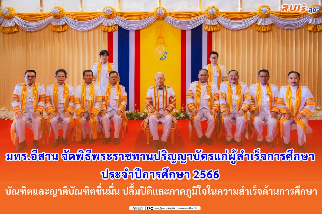วันที่ 15 พฤศจิกายน 2567 มหาวิทยาลัยเทคโนโลยีราชมงคลอีสาน จัดพิธีพระราชทานปริญญาบัตรแก่ผู้สำเร็จการศึกษา จากมหาวิทยาลัยเทคโนโลยีราชมงคลอีสาน ประจำปีการศึกษา 2566 นับเป็นพระมหากรุณาธิคุณอย่างหาที่สุดมิได้ ต่อบัณฑิตของมหาวิทยาลัยเทคโนโลยีราชมงคลอีสาน ซึ่งในการนี้ พระบาทสมเด็จพระปรเมนทรรามาธิบดีศรีสินทรมหาวชิราลงกรณ พระวชิรเกล้าเจ้าอยู่หัว ทรงพระกรุณาโปรดเกล้าฯ ให้ พลเอก สุรยุทธ์ จุลานนท์ ประธานองคมนตรี เป็นผู้แทนพระองค์ มอบปริญญาบัตรแก่ผู้สำเร็จการศึกษาจากมหาวิทยาลัยเทคโนโลยีราชมงคลอีสาน ประจำปีการศึกษา 2566 ณ อาคารเฉลิมพระเกียรติ ในโอกาสฉลองพระชนมายุ 5 รอบ 2 เมษายน 2558 ศูนย์การศึกษาหนองระเวียง มหาวิทยาลัยเทคโนโลยีราชมงคลอีสาน ต.หนองระเวียง อ.เมืองนครราชสีมา จ.นครราชสีมา