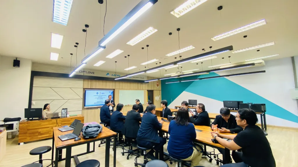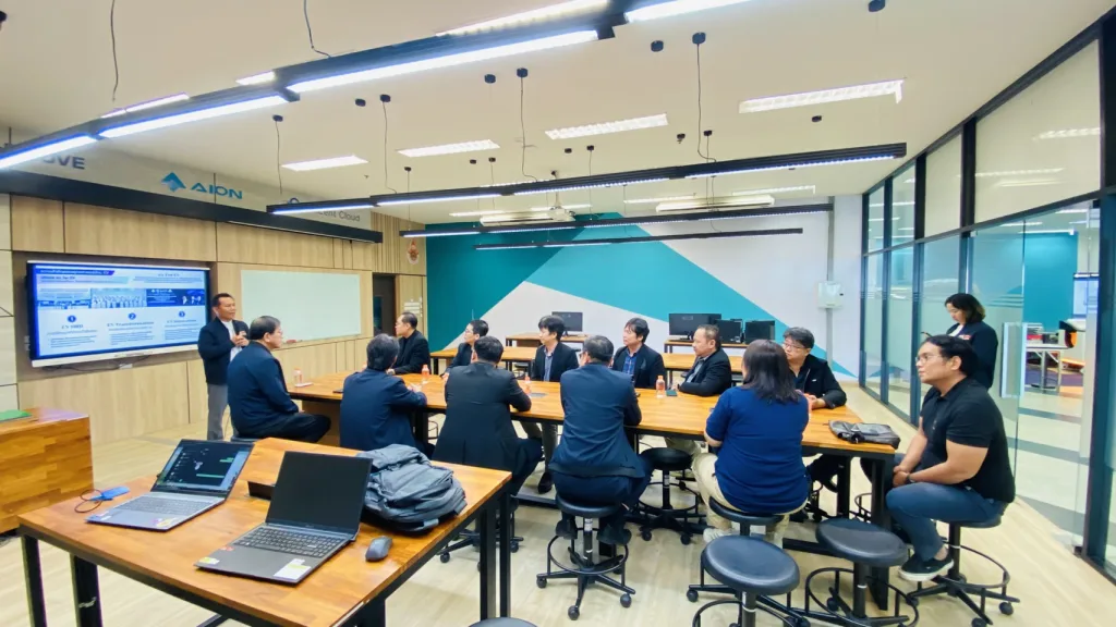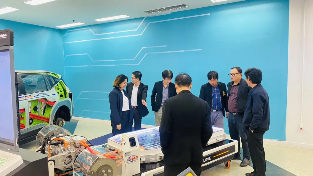 ในการนี้ ผู้ช่วยศาสตราจารย์ ดร.เอนก เจริญภักดี รองอธิการบดีฝ่ายยุทธศาสตร์ นโยบายและแผน กำกับดูแลยุทธศาสตร์ด้านยานยนต์ไฟฟ้า ได้กล่าวต้อนรับและนำเสนอภาพรวมบทบาทของสถาบันยานยนต์ไฟฟ้าในฐานะกลไกหลักของมหาวิทยาลัยในการขับเคลื่อนยุทธศาสตร์ด้านยานยนต์ไฟฟ้า การพัฒนากำลังคนสมรรถนะสูง งานวิจัย นวัตกรรม และการบริการวิชาการที่เชื่อมโยงกับภาคอุตสาหกรรมและการพัฒนาพื้นที่อย่างเป็นรูปธรรม สำหรับมหาวิทยาลัยราชภัฏมหาสารคาม นำโดย อาจารย์ ดร.มาวิน ปูนอน ผู้ช่วยอธิการบดี ได้เข้าร่วมรับฟังการบรรยาย แลกเปลี่ยนองค์ความรู้ และเยี่ยมชมพื้นที่ปฏิบัติการจริงของศูนย์ฝึกอบรม RMUTI–CHELOVE EV TRAINING CENTER ซึ่งเป็นศูนย์ฝึกอบรมและถ่ายทอดเทคโนโลยียานยนต์ไฟฟ้าที่ครบวงจร นอกจากนี้ ยังได้รับเกียรติจากภาคเอกชนพันธมิตร ได้แก่ บริษัท เชเลิฟ อินเตอร์เนชั่นแนล เอ็ดดูเคชั่น กรุ๊ป จำกัด เข้าร่วมการเยี่ยมชมและแลกเปลี่ยนมุมมองเชิงอุตสาหกรรม นำโดย นางสาวภาวิณี มาตรักษา ผู้จัดการฝ่ายการตลาด และ นายศิวกร กาญจนปัทม ผู้จัดการฝ่ายผลิตภัณฑ์และโซลูชัน ซึ่งได้ร่วมแลกเปลี่ยนแนวทางการพัฒนาหลักสูตร การฝึกอบรมเชิงปฏิบัติการ และการถ่ายทอดเทคโนโลยียานยนต์ไฟฟ้า เพื่อให้สอดคล้องกับความต้องการของภาคอุตสาหกรรมในปัจจุบันและอนาคต
