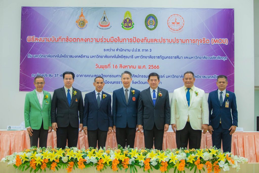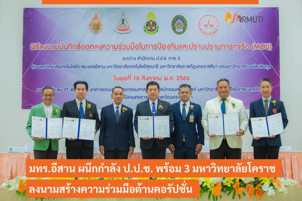 วันที่ 16 สิงหาคม 2566 มหาวิทยาลัยเทคโนโลยีราชมงคลอีสาน โดย รองศาสตราจารย์ ดร.โฆษิต ศรีภูธร อธิการบดี มทร.อีสาน พร้อมคณะผู้บริหารและเจ้าหน้าที่มหาวิทยาลัย ให้การต้อนรับ นายนิวัติไชย เกษมมงคล เลขาธิการคณะกรรมการป้องกันและปราบปรามการทุจริตแห่งชาติ (ป.ป.ช.) นายณัฐวุฒ ขมประเสริฐ รองเลขาธิการคณะกรรมการ ป.ป.ช.ภาค 3 คณะผู้บริหารมหาวิทยาลัยเทคโนโลยีสุรนารี คณะผู้บริหารมหาวิทยาราชภัฏนครราชสีมา และคณะผู้บริหารมหาวิทยาลัยวงษ์ชวลิตกุล ในพิธีลงนามบันทึกข้อตกลงความร่วมมือในการป้องกันและปราบปรามการทุจริตระหว่าง สํานักงาน ป.ป.ช. ภาค 3 กับ 4 มหาวิทยาลัยในจังหวัดนครราชสีมา ณ ณ ห้องประชุม 37-401 ชั้น 4 อาคารคณะสถาปัตยกรรมศาสตร์และศิลปกรรมสร้างสรรค์ มหาวิทยาลัยเทคโนโลยีราชมงคลอีสาน ตําบลในเมือง อําเภอเมืองนครราชสีมา จังหวัดนครราชสีมา