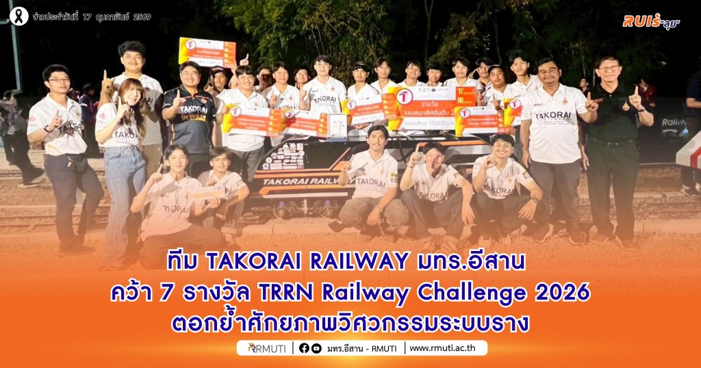 มหาวิทยาลัยเทคโนโลยีราชมงคลอีสาน ขอแสดงความยินดีและชื่นชม ทีม TAKORAI RAILWAY และนักศึกษาสาขาวิชาวิศวกรรมระบบราง คณะระบบรางและการขนส่ง มหาวิทยาลัยเทคโนโลยีราชมงคลอีสาน นครราชสีมา ที่ได้รับโอกาสเข้าร่วมการแข่งขันออกแบบหัวรถจักรไฟฟ้า TRRN Railway Challenge 2026 ณ ศูนย์อนุรักษ์พันธุกรรมพืชอันเนื่องมาจากพระราชดำริฯ (อพ.สธ.-มทส.) อำเภอสีคิ้ว จังหวัดนครราชสีมา ระหว่างวันที่ 13–15 กุมภาพันธ์ 2569 ซึ่งเป็นการเข้าร่วมการแข่งขันต่อเนื่องเป็นปีที่ 2 และสามารถสร้างผลงานโดดเด่นคว้า 7 รางวัล จากรายการแข่งขัน ได้แก่ รางวัลชนะเลิศอันดับที่ 1 ในประเภท Ride Comfort Challenge, Punctuality Challenge และ Technical Poster Challenge รางวัลรองชนะเลิศอันดับที่ 1 ประเภท Energy Consumption Challenge รวมถึงรางวัลรองชนะเลิศอันดับที่ 2 ประเภท CAD Challenge และ Design Challenge