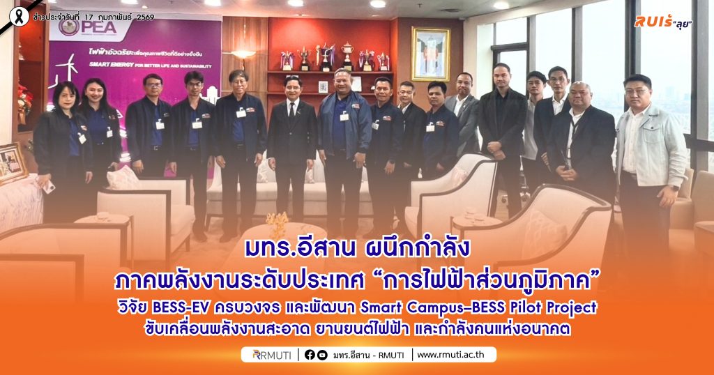 วันที่ 17 กุมภาพันธ์ 2569 มหาวิทยาลัยเทคโนโลยีราชมงคลอีสาน นครราชสีมา โดย รองศาสตราจารย์ ดร.โฆษิต ศรีภูธร อธิการบดี ได้นำคณะผู้บริหารมหาวิทยาลัยฯ และสถาบันยานยนต์ไฟฟ้า ประกอบด้วย ผู้ช่วยศาสตราจารย์ชูชัย ต.ศิริวัฒนา ที่ปรึกษาอธิการบดีด้านยานยนต์ไฟฟ้า ผู้ช่วยศาสตราจารย์ ดร.เอนก เจริญภักดี รองอธิการบดีฝ่ายยุทธศาสตร์ นโยบายและแผน อาจารย์ ดร.ประจวบ อินระวงค์ ผู้ช่วยอธิการบดีและผู้อำนวยการสถาบันยานยนต์ไฟฟ้า ผู้ช่วยศาสตราจารย์ ดร.รุ่งเพชร ก่องนอก รองผู้อำนวยการฝ่ายกิจการนักศึกษาและโครงการพิเศษ และผู้ช่วยศาสตราจารย์ ดร.ธงชัย คล้ายคลึง ผู้อำนวยการศูนย์ฝึกอบรมยานยนต์ไฟฟ้า เข้าพบ นายมงคล ตรีกิจจานนท์ ผู้ว่าการการไฟฟ้าส่วนภูมิภาค เพื่อหารือแนวทางความร่วมมือด้านการวิจัยและพัฒนาเทคโนโลยีระบบกักเก็บพลังงานสำรอง (Battery Energy Storage System: BESS) ณ สำนักงานใหญ่การไฟฟ้าส่วนภูมิภาค กรุงเทพมหานคร โดยได้รับเกียรติจากคณะผู้บริหารการไฟฟ้าส่วนภูมิภาค ประกอบด้วย