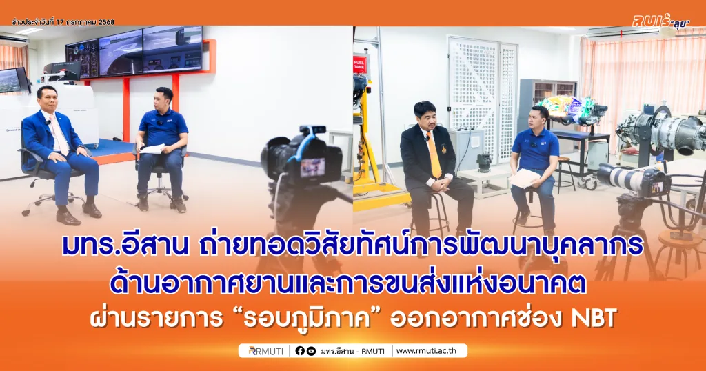 วันที่ 16 กรกฎาคม 2568 มหาวิทยาลัยเทคโนโลยีราชมงคลอีสาน โดยรองศาสตราจารย์ ดร.โฆษิต ศรีภูธร อธิการบดี มทร.อีสาน มอบหมายให้ ผู้ช่วยศาสตราจารย์ ดร.เอนก เจริญภักดี รองอธิการบดีฝ่ายยุทธศาสตร์ นโยบายและแผน และ รองศาสตราจารย์ ดร.อภิชิต คำภาหล้า คณบดีคณะระบบรางและการขนส่ง เข้าร่วมถ่ายทำรายการ “รอบภูมิภาค” ตอนพิเศษ “สู่อนาคตบนเส้นทางอากาศ กับ มทร.อีสาน” เพื่อร่วมถ่ายทอดวิสัยทัศน์ด้านการพัฒนาหลักสูตร สาขาวิชา และการเตรียมกำลังคนด้าน “อากาศยานและการขนส่งแห่งอนาคต” ซึ่งถือเป็นสาขาเป้าหมายสำคัญของประเทศในยุคที่ระบบโลจิสติกส์และเทคโนโลยีก้าวสู่ Smart Mobility ณ ศูนย์การศึกษาหนองระเวียง มหาวิทยาลัยเทคโนโลยีราชมงคลอีสาน