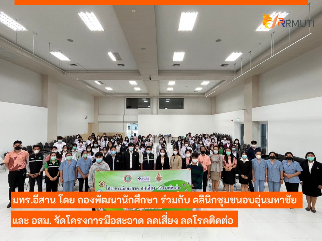 วันที่ 16 พฤศจิกายน 2565 มหาวิทยาลัยเทคโนโลยีราชมงคลอีสาน โดย แผนกงานพยาบาลและการประกันสุขภาพ กองพัฒนานักศึกษา มทร.อีสาน ร่วมกับ คลินิกชุมชนอบอุ่นมหาชัยและอาสาสมัครสาธารณสุขประจำหมู่บ้าน กลุ่มมหาวิทยาลัยเทคโนโลยีราชมงคลอีสาน จัดโครงการมือสะอาด ลดเสี่ยง ลดโรคติดต่อ ณ ห้องประชุมชั้น 4 อาคารคณะสถาปัตยกรรมศาสตร์และศิลปกรรมสร้างสรรค์ มทร.อีสาน โดยได้รับเกียรติจาก นายหาญชัย พันธุ์งาม